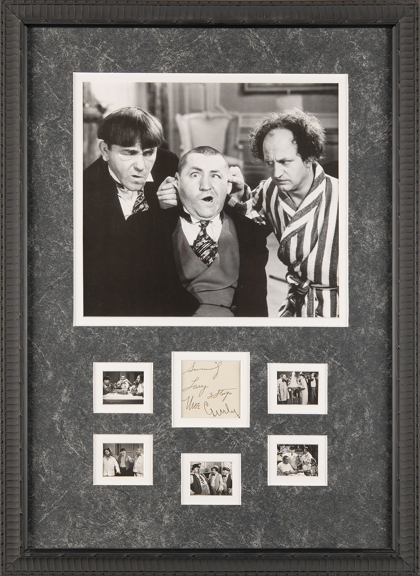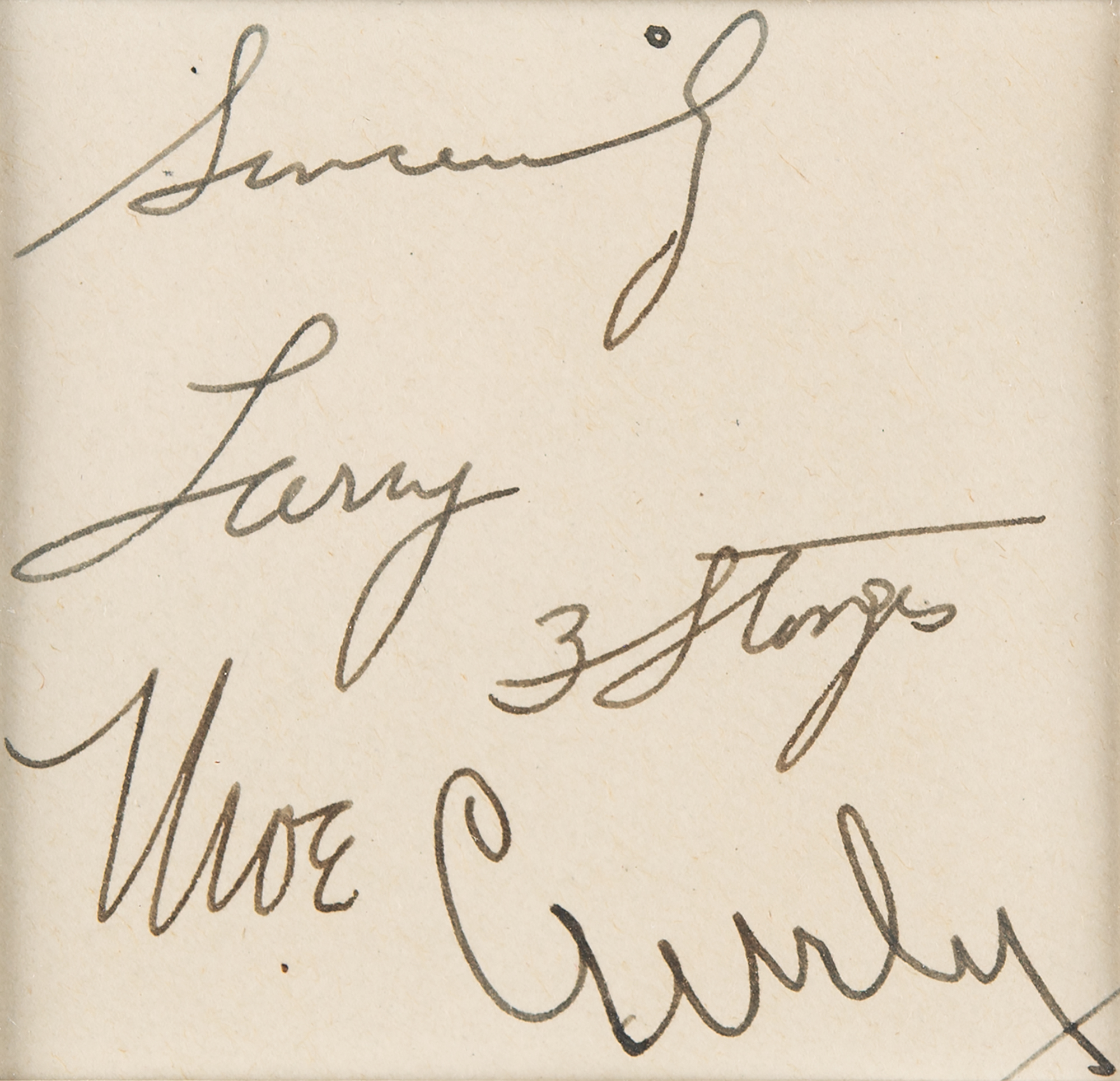 Vintage fountain pen signatures of The Three Stooges – "Sincerely, Larry, 3 Stooges," "Moe," and "Curly” – on an off-white 2.25 x 2.25 sheet, which has been double-matted and framed with one large photo and five small photos of the legendary slapstick trio to an overall size of 16.75 x 23. In fine condition.