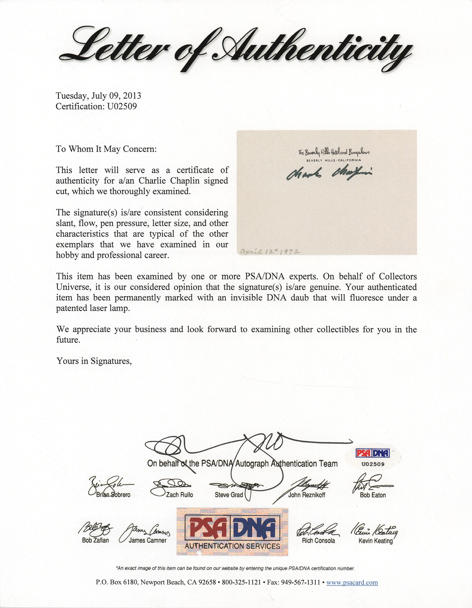 Felt tip signature, "Charles Chaplin," on an off-white 5.5 x 3.5 card from the Beverly Hills Hotel. Collector's notation to bottom indicates that it was signed on April 12, 1972. Just two days prior, Chaplin received a record setting standing ovation of twelve minutes when receiving his Honorary Oscar at the 44th Academy Awards. In fine condition, with a faint central horizontal crease. Accompanied by a full letter of authenticity from PSA/DNA.