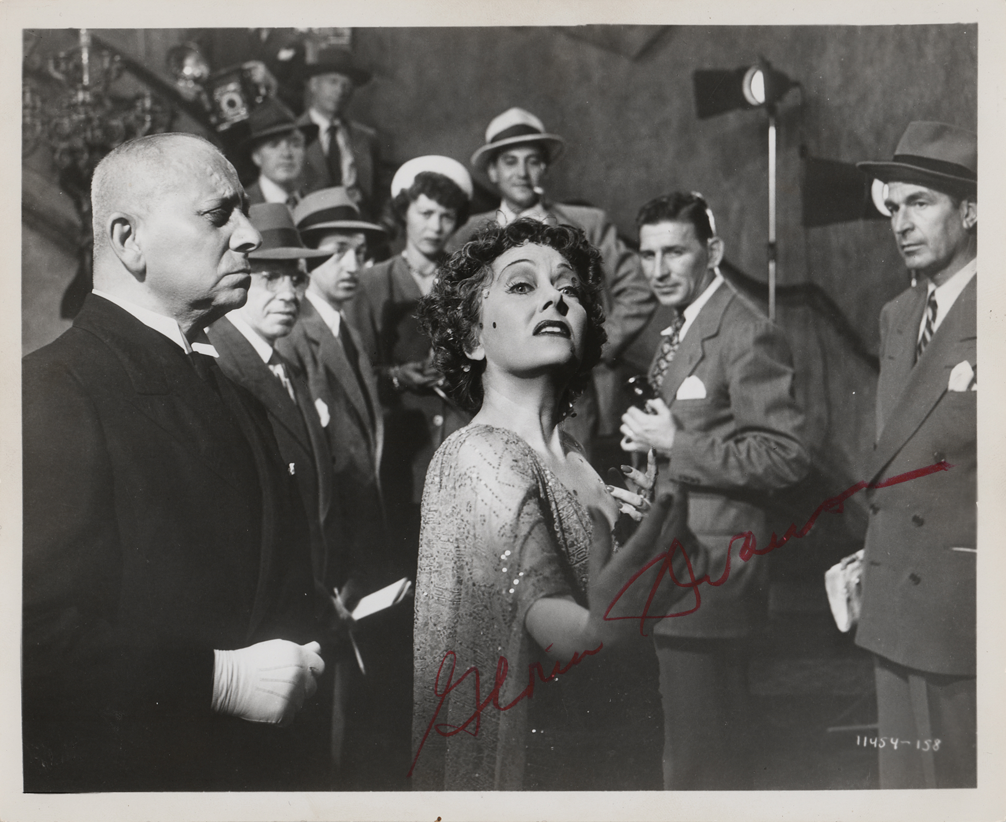 Very nice glossy 10 x 8 photo of Gloria Swanson in her most famous role as Norma Desmond in Sunset Boulevard, signed in red artist's pencil by the actress. In fine condition. Accompanied by a full letter of authenticity from PSA/DNA.