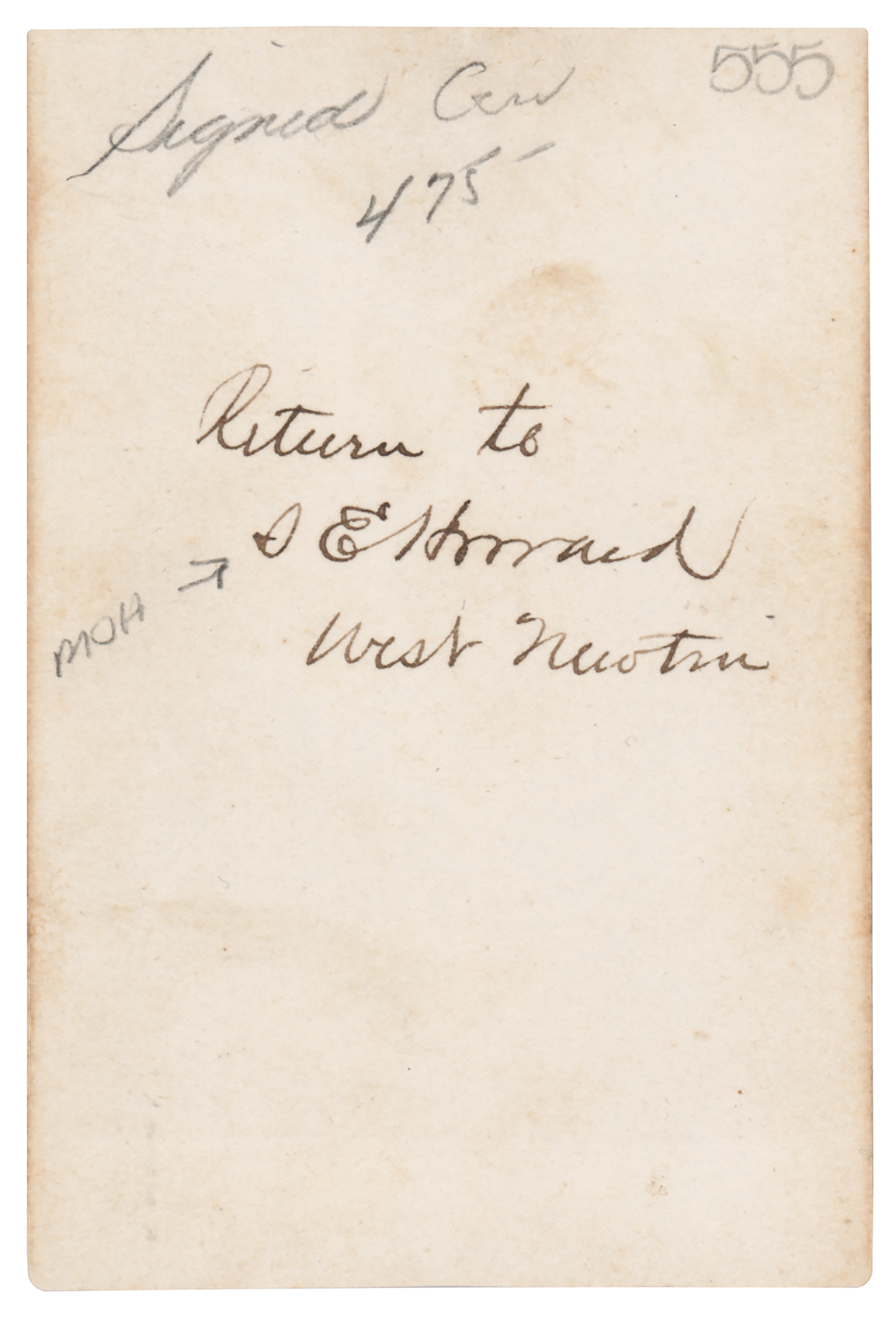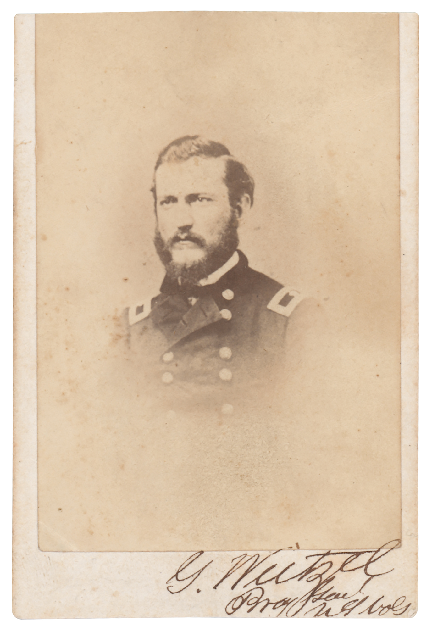 Union general and acting mayor of New Orleans during the federal occupancy of the city (1835–1884). Uncommon 2.5 x 3.5 carte-de-visite photo of Weitzel in uniform, signed on the mount in ink, "G. Weitzel, Brig. Gen. U.S. Vols." The reverse is annotated by Medal of Honor recipient Squire Edward Howard, "Return to S. E. Howard, West Newton." In fine condition, with trimmed edges.