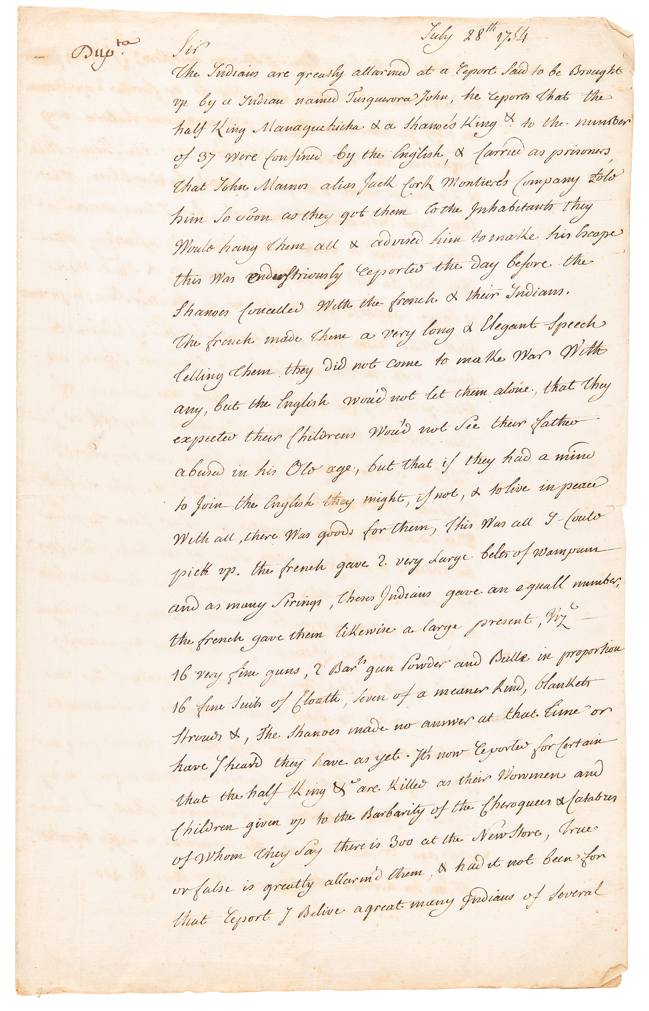 The text of Stobo's letter, in part: "The Indians are greatly alarmed at a Report said to be brought up by an Indian named Tusquerora John. He reports that the Half King Monecatootha, & a Shanoe's King, & to the number of 37, were confined by the English & carried as Prisoners, that John Meinor alias Jack Cork, of Montour's Company, told him so soon as they got them to the Inhabitants they would hang them all & advised him to make his Escape. This was industriously reported the Day before the Shawonese counselled with the French & their Indians. The French made them a very long & elegant speech telling them they did not come to make war with any, but the English wou'd not let them alone, that they expected their children would not see their father abused in his old age, but that if they had a mind to join the English they might, if not, & to live in peace with all, there were goods for them. This was all I could pick up. The French gave 2 very large belts of wampum and as many strings, their Indians gave an equall number. The French gave them likewise a large present, viz 16 very fine guns, 2 bar'ls gun powder and bullets in proportion…