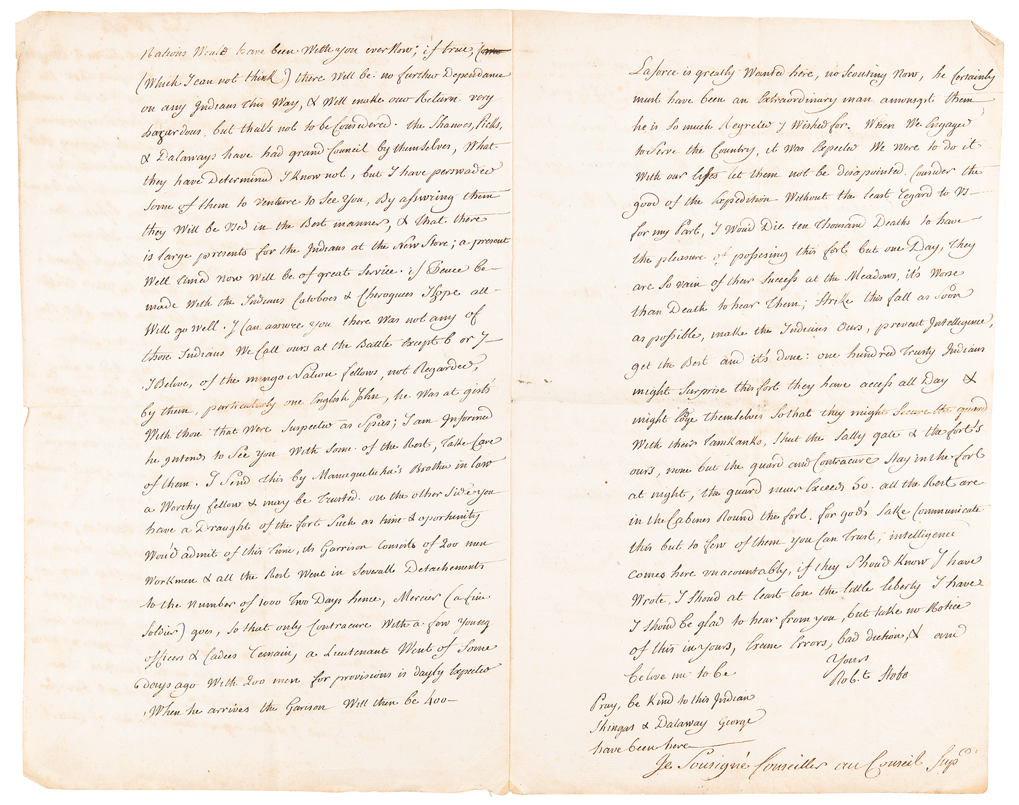 Laforce is greatly wanted here, no scouting now, he certainly must have been an extraordinary man amongst them. He is so much regretted and wished for. When we engaged to serve the Country, it was expected we were to do it with our lifes, let them not be disappointed. Consider the good of the Expedition without the least regard to us—for my part, I would die then thousand deaths to have the pleasure of possessing this fort but one day, they are so vain of their success at the meadows, it's worse than Death to hear them; strike this fall as soon as possible, make the Indians ours, prevent intelligence, get the best and it's done: one hundred trusty Indians might surprize this Fort, they have Access all day & might lodge themselves so that they might secure the Guard with their Tomhawks, shut the Sally Gate & the fort's ours, none but the guard and Contracure stay in the fort at night. For God's sake communicate this but to few of them you can trust; intelligence comes here unaccountably, if they should know I have wrote, I should at least lose the little liberty I have. I should be glad to hear from you, but take no notice of this in yours." In fine condition.