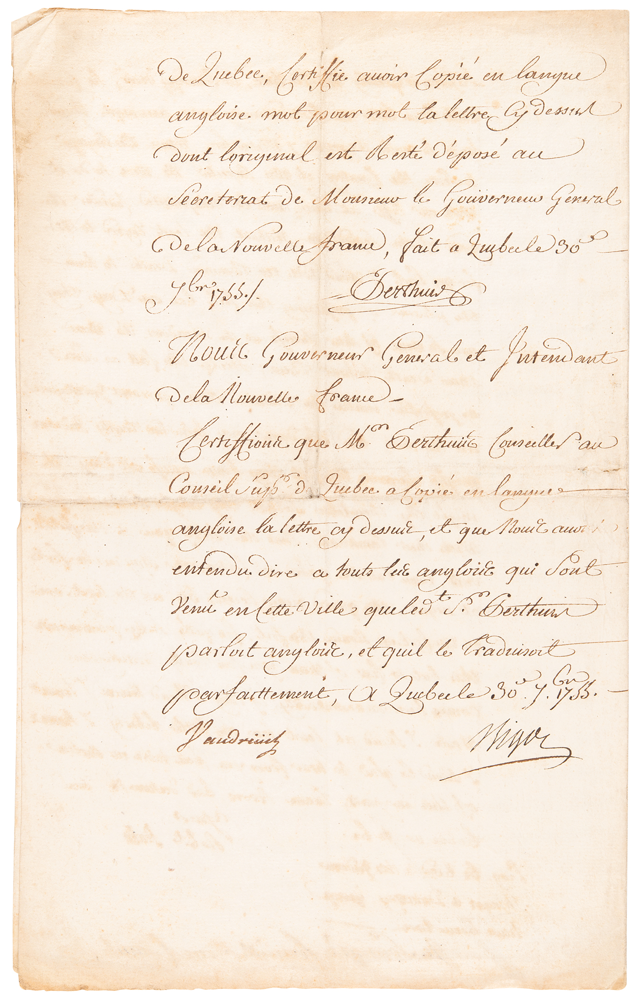 Contemporary manuscript copy of Robert Stobo's letter of July 28, 1754, written from captivity at Fort Duquesne, three pages on two adjoining sheets, 8 x 12.75, certified on the reverse by Joseph Perthuis (1714-1782), merchant and counselor to the Superior Council of Québec; Pierre de Rigaud de Vaudreuil (1698-1778), last governor of New France; and François Bigot (1703-1778), intendant of New France. Their authentications, penned on the reverse, read (translated): "I, the undersigned councilor at the Superior Council of Quebec, certify that I have copied in English word for word the above letter, the original of which has been deposited at the secretariat of the Governor General of New France, made in Quebec on 30 September 1755. Perthuis." Then, underneath: "We, the Governor General and Intendant of New France, certify that Mr. Perthuis, advisor to the Superior Council of Quebec, has copied the above letter in English, and that we have heard from all the Englishmen who came to this city that the said Sr. Perthuis spoke English, and that he translated it perfectly. At Quebec City, 30 September 1755. Vaudreuil. Bigot."