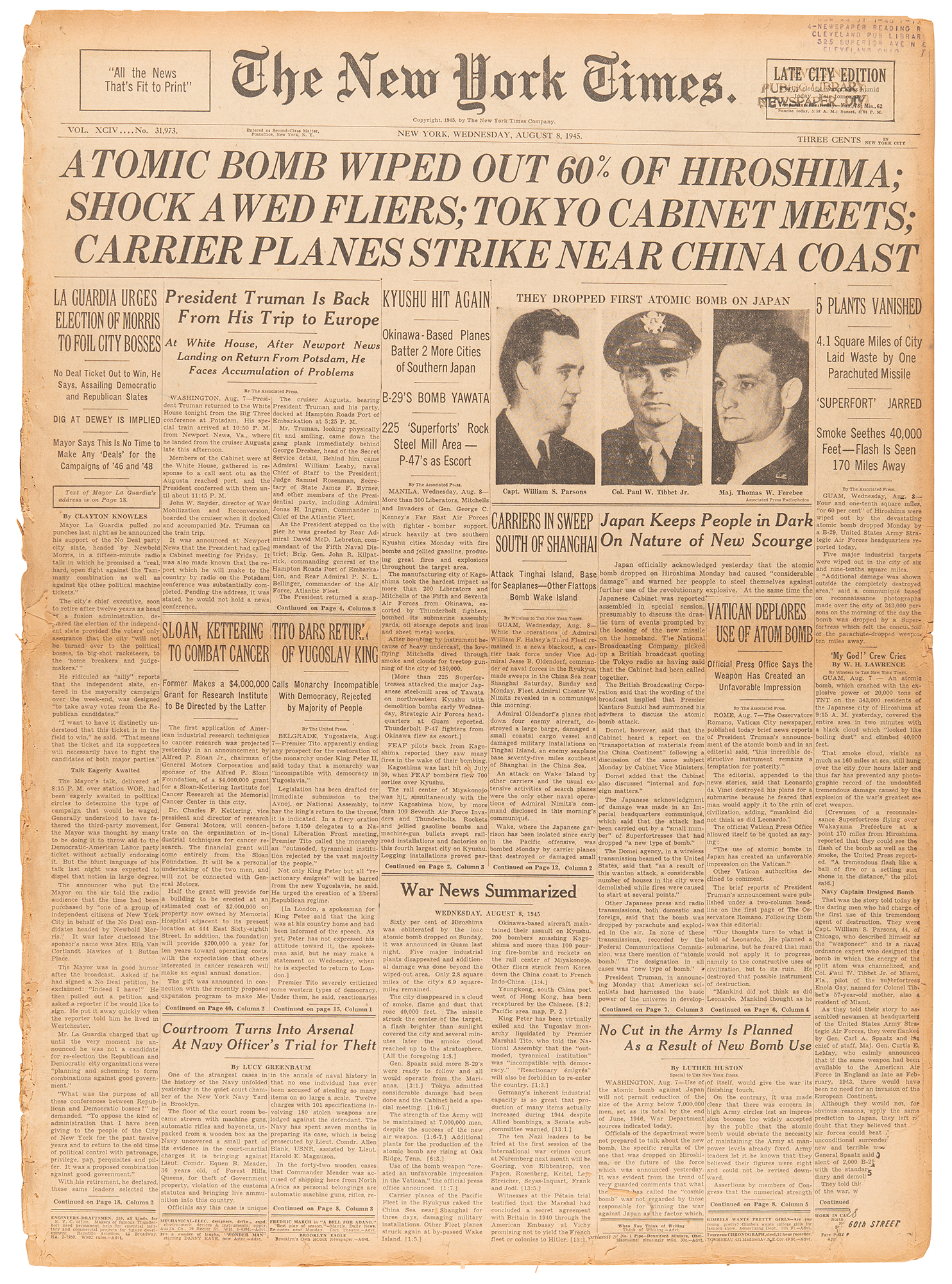 Complete 'late city edition' of the New York Times from August 8, 1945, 16.5 x 22.5, 40 pages, with large banner headline: "Atomic Bomb Wiped Out 60% of Hiroshima; Shock Awed Fliers; Tokyo Cabinet Meets; Carrier Planes Strike Near China Cost." The front page features portraits of Enola Gay crewmen William S. Parsons, Paul W. Tibbets, and Thomas W. Ferebee, and reports on the devastation of the atomic bomb: "Sixty per cent of Hiroshima was obliterated by the lone atomic bomb dropped on Sunday…The city disappeared in a cloud of smoke, flame and dust that rose 40,000 feet." In good to very good condition, with overall toning, loss to the lower right corner of the first page, and chipping to the fragile edges.