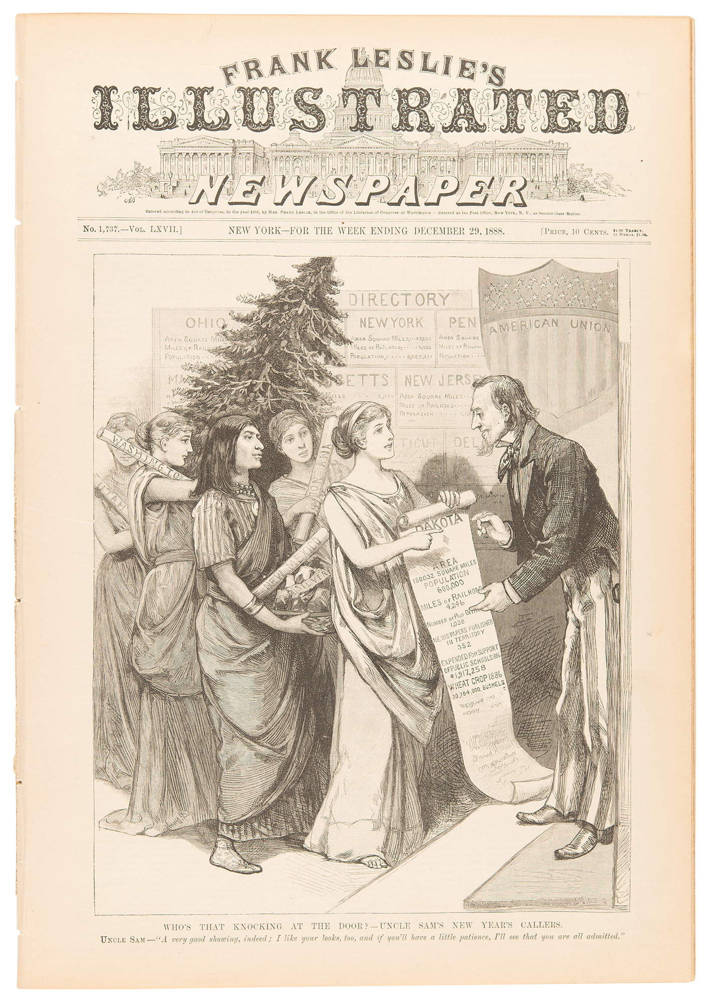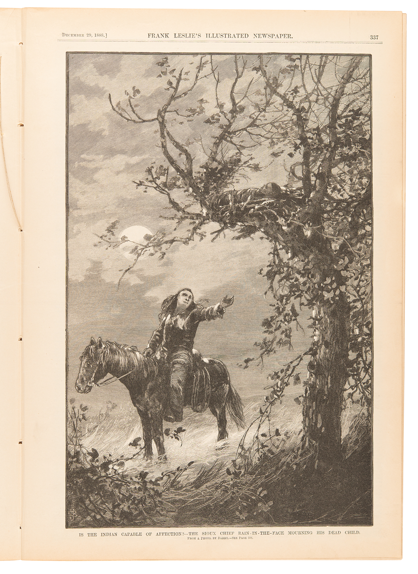 Complete, disbound issue of Frank Leslie's Illustrated Newspaper from December 29, 1888, 11 x 16, sixteen pages, featuring a woodcut illustration of Uncle Sam attending to New Years' callers on the front page. Inside is an article entitled "A Story of Indian Affection," about Rain in the Face and the death of his son, Koska, illustrated with a full-page woodcut on the following page, captioned: "Is the Indian Capable of Affection?—The Sioux Chief Rain-in-the-Face Mourning His Dead Child." In fine condition.