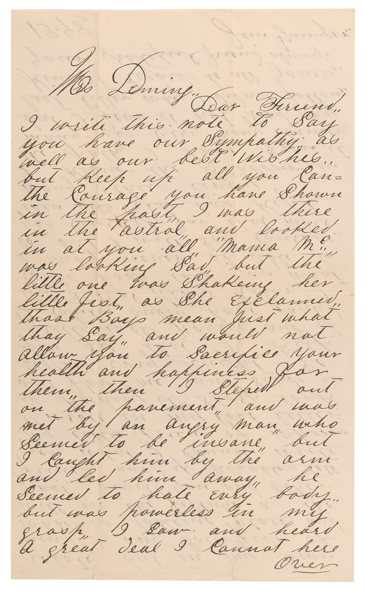 ALS, one page both sides, 7.5 x 12.5, dated 1898. Addressed from the Minnesota State Prison, a handwritten letter to “Mrs. Deming,” Cora ‘Corona’ McNeill Deming, in full (spelling and grammar retained): “I write this note to say you have our Sympathy, as well as our best wishes, but keep up all you can the courage you have shown in the past, I was there in the astral, and looked in at you all, Mama M’c was looking sad, but the little one was shakeing her little fist, as she exclaimed, those Boys mean just what they say, and you would not allow you to sacrifice your health and happiness for them, then I steped out on the pavement and was met by an angry man, who seemed to be insane, but I caught him by the arm and led him away, he seemed to hate evry body, but was powerless in my grasp, I saw and heard a great deal I cannot here relate, but in my own mind I am satisfied of what is takeing place, and will in the future as the past, visit you and other frinds, and if posable, tell you what I cannot write, my little friend of whom I wrote in my last letter, is keeping a sharp look out for me, and sends in report evry knight, so you see that I keep pretty well posted, and if I could only have found the astral plane clear, I could have told you what I may never be able to do, but I will say courage, yes courage, for that more than alls else has kept many others living. I know the shaddow in the path, I have seen it many – yes many times, but I fear it not read my last letter why I did not follow, kindest regards to all.” In fine condition.