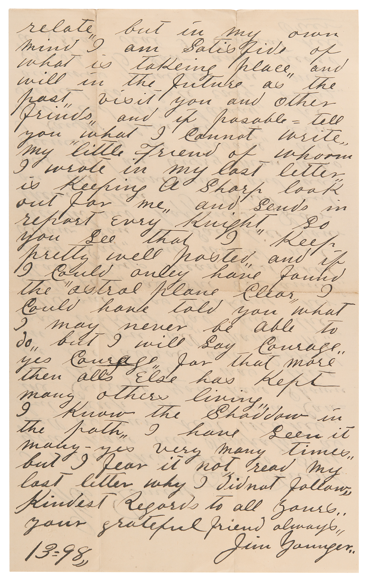 Fascinating prison letter from Jim Younger, who describes his visions from “the astral plane,” and stresses “courage” in the face of adversity—“I know the shaddow in the path, I have seen it many – yes many times, but I fear it not”