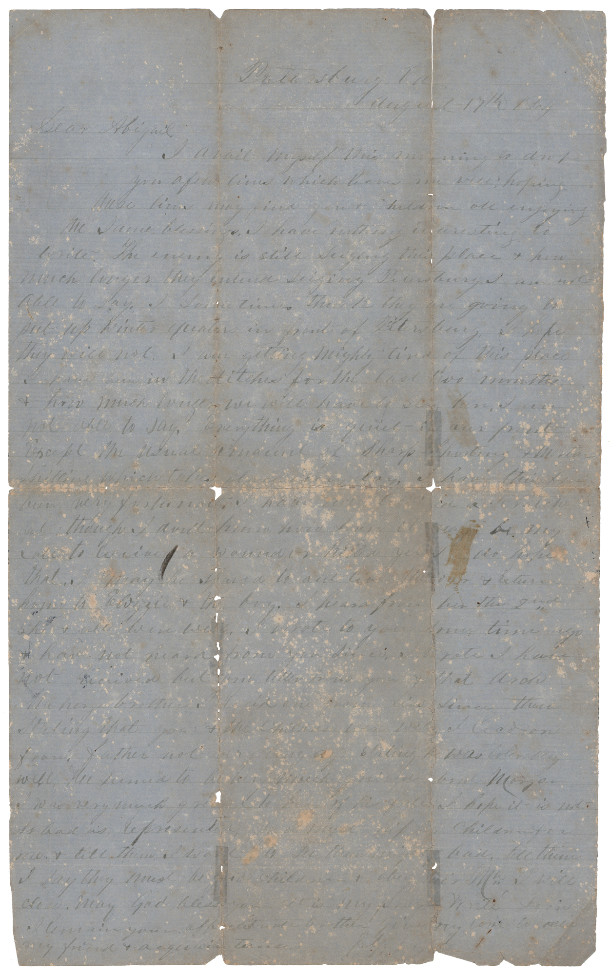 Civil War-dated ALS signed “E. W. Jones, 59th Ala. Regt.,” one page both sides, 8 x 13, August 17, 1864. Handwritten letter from Petersburg, Virginia, while under siege. In part: "The enemy is still sieging this place & how much longer they intend sieging Petersburg I am not able to say. I sometimes think they are going to put up winter quarters in front of Petersburg. I hope they will not. I am getting mighty tired of this place. I have been in the ditches for the last two months & how much longer we will have to stay here, I am not able to say. Everything is quiet in our front except the usual amount of Sharp-Shooting & Mortar Shelling which takes place during the day. I have this far been very fortunate. I have not got a fight yet, though I don't know how long it may be my call to receive a wound or killed yet." In fair condition, with split intersecting folds, heavy soiling and staining affecting legibility of portions of the text, and fading to portions of the ink.