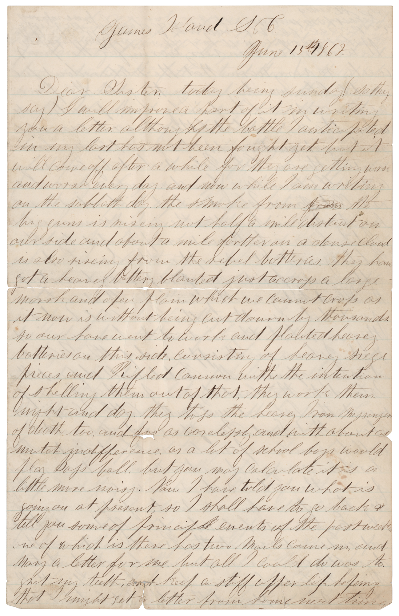 In part: "Dear Sister…the smoke from the big guns is riseing not half a mile distant on our side and about a mile farther on a dense cloud is also riseing from the rebel batteries. they have got a heavey battery planted just accross a large marsh and open plain which we cannot cross as it now is without being cut down by thousands. so our have went to work and planted heavey batteries on this side, consisting of heavey siege pieces, and Rifled cannon with the intention of shelling them out of that. they work them night and day. they toss the heavey Iron Messengers of death too, and for as carelessly and with about as mutch indifference as a lot of school boys would play Bass ball, but you may calculate it is a little more noisy….