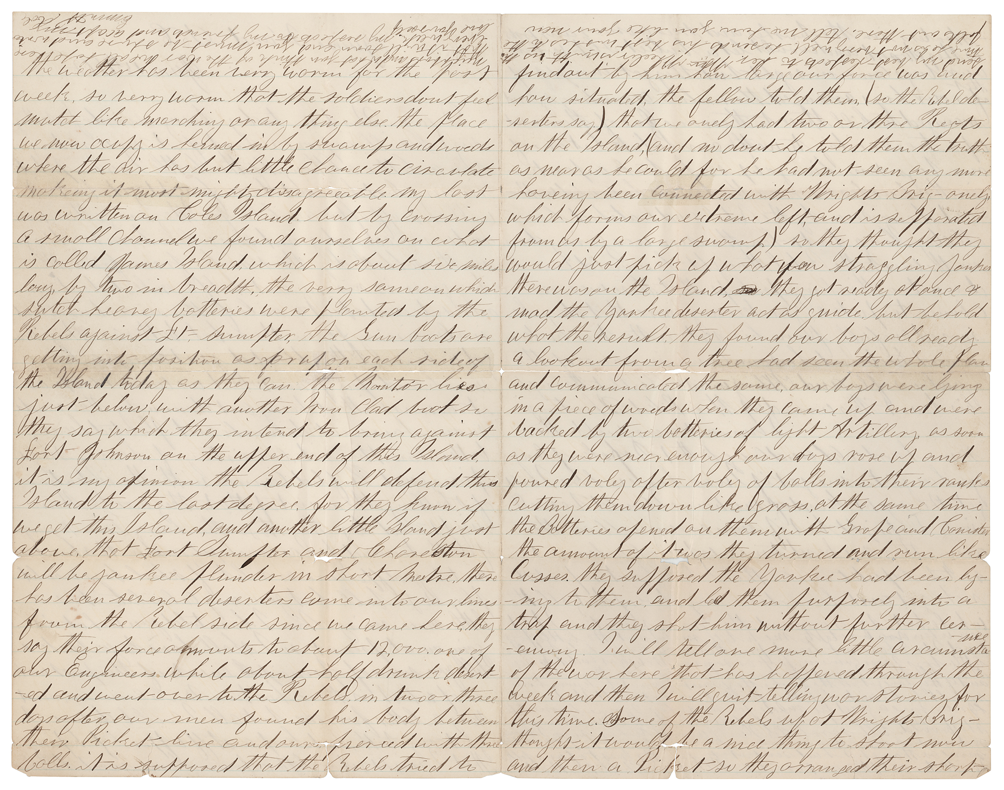 Civil War-dated ALS, signed “Emmett Cole,” four pages on two adjoining sheets, 8 x 12.5, June 15, 1862. Handwritten letter by Emmett Cole of Company F, 8th Michigan Infantry, reporting on action at James Island, South Carolina. The Battle of Secessionville, won by the Confederates, would be fought the next day on June 16, 1862.