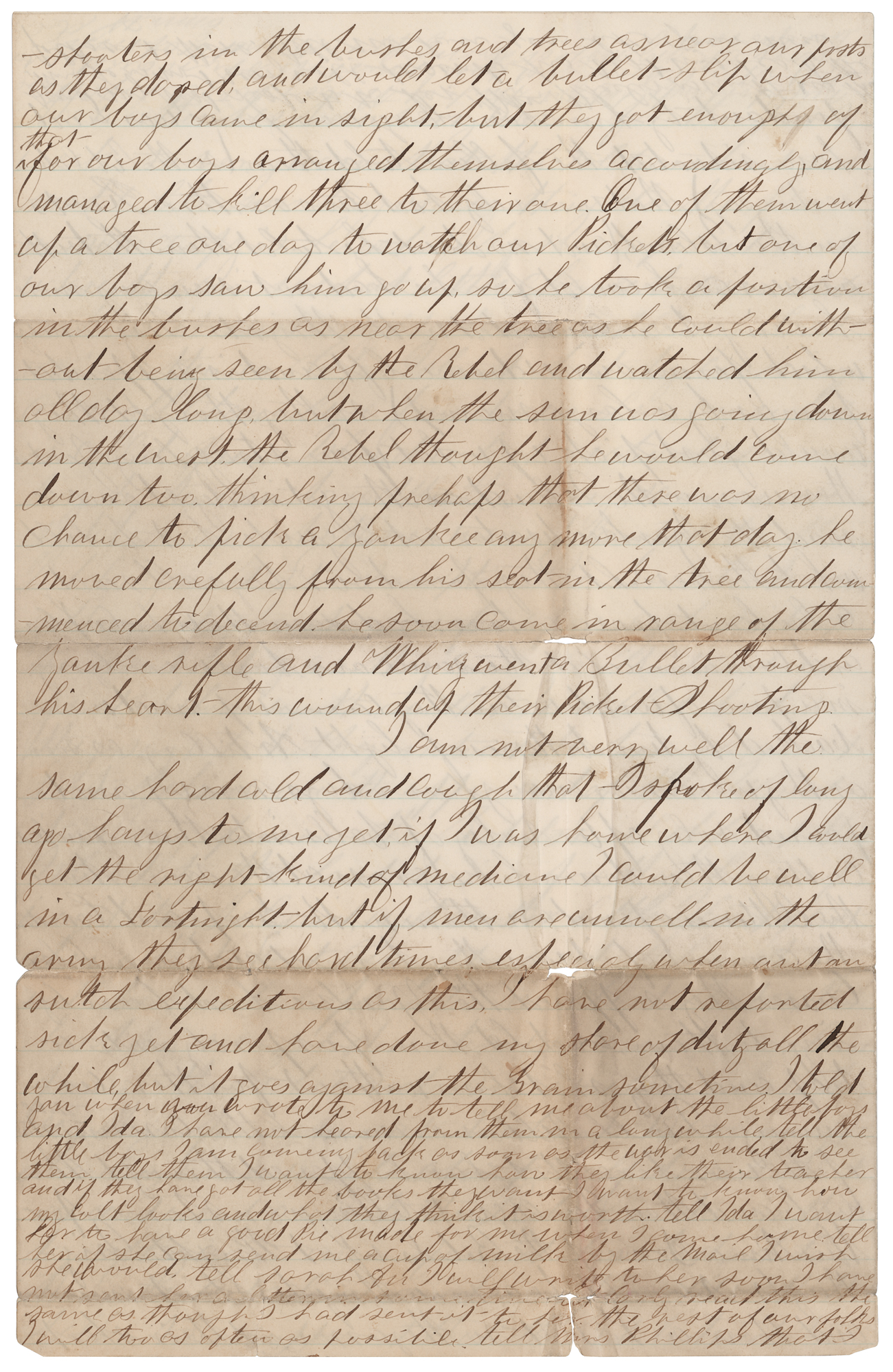 I am not very well the same hard cold and cough that I spoke of long ago hangs to me yet. if I was home where I could get the right kind of medicine I could be well in a Fortnight, but if men are unwell in the army they see hard times especialy when out on sutch expeditions as this. I have not reported sick yet and have done my share of duty all the while, but it goes against the Grain sometimes. I told you when you wrote to me to tell me about the little boys and Ida I have not heared from them in a long while tell the little boys I am comeing back as soon as the war is ended to see them." In good to very good condition, with splits to intersecting folds.