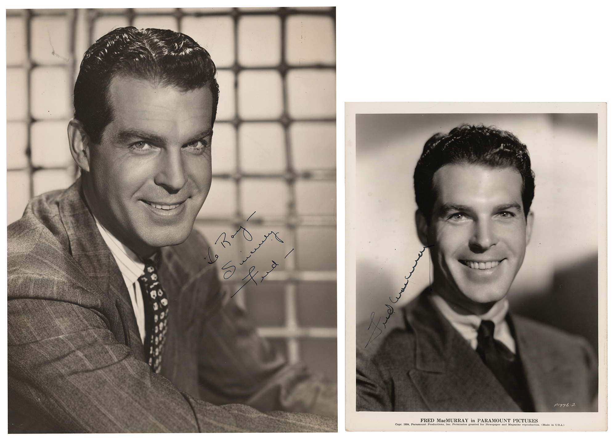 Two photos: a vintage matte-finish 10.25 x 13.25 photo of Fred MacMurray in a suit and tie by A. L. 'Whitey' Schafer, neatly signed and inscribed in fountain pen, "To Roy—Sincerely, Fred—"; and a vintage glossy 8 x 10 Paramount Pictures publicity photo of the actor, signed in black felt tip, "Fred MacMurray." In fine condition, with evidence of a removed inscription to the smaller photo.