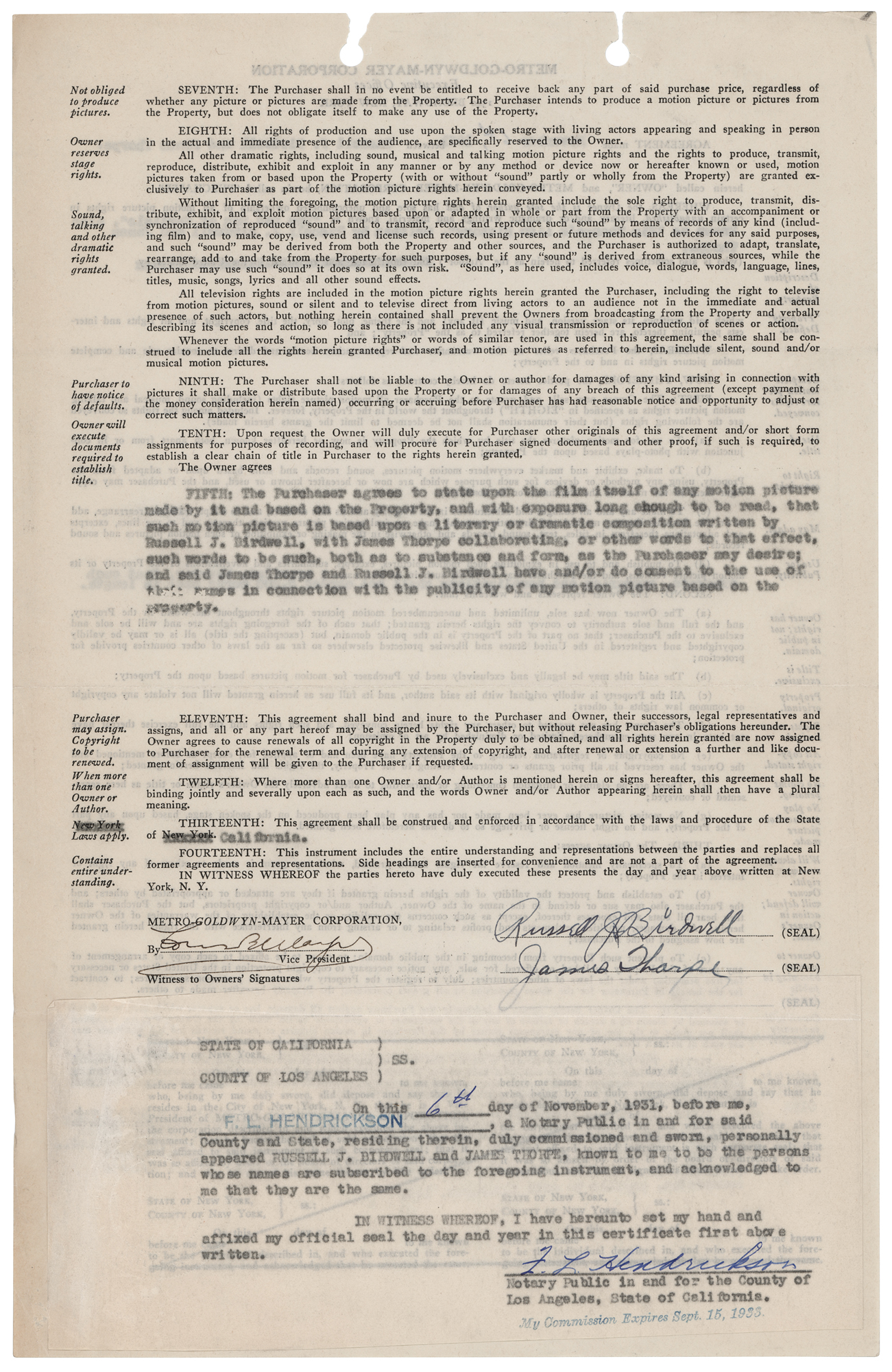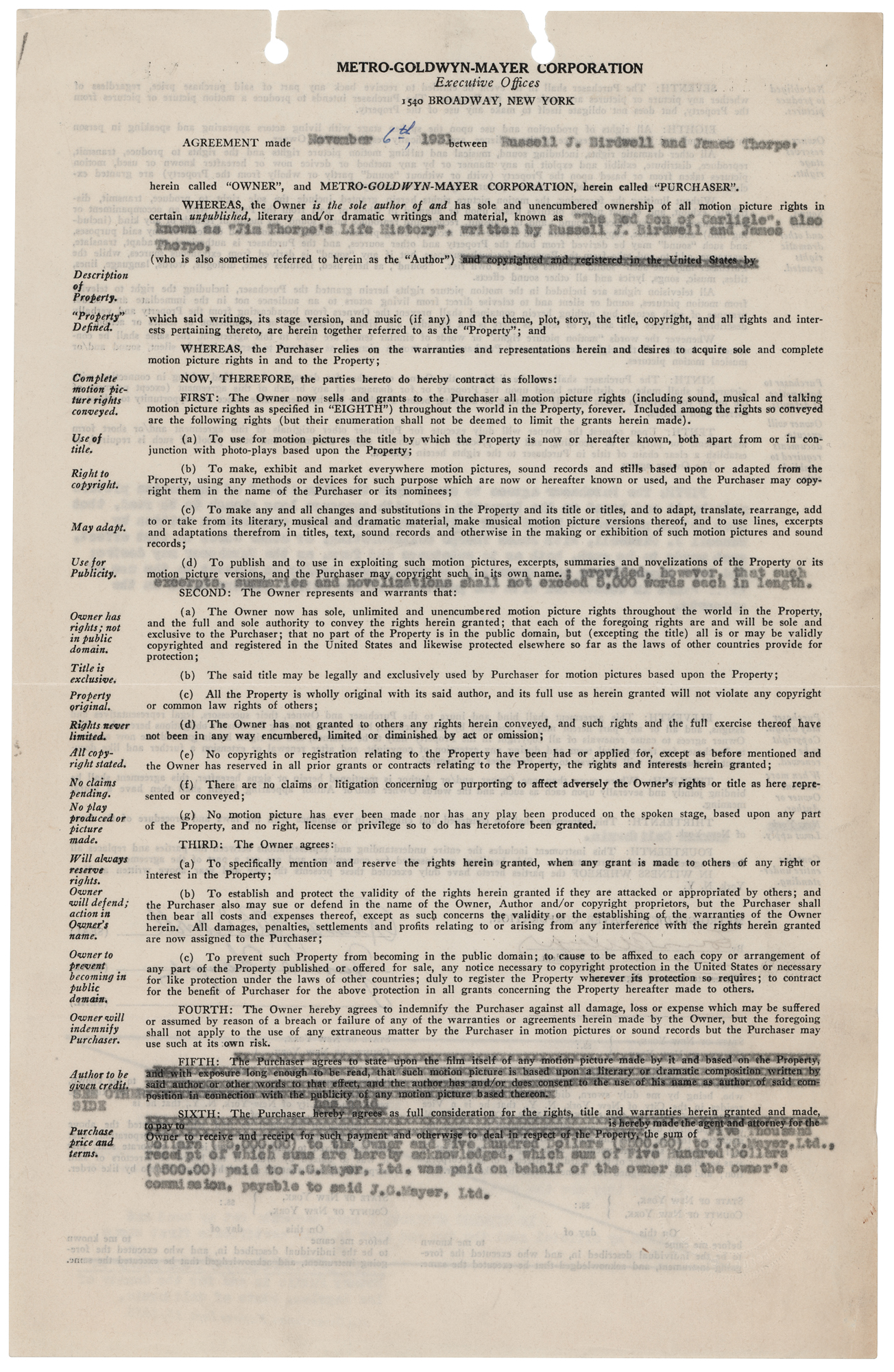 Versatile Native American athlete (1887–1953), widely regarded as the finest all-around athlete of the twentieth century, who won two Olympic gold medals and excelled in football, baseball, and basketball. His Olympic medals were stripped from him for an ostensible violation of the amateur-status rule (Thorpe had earlier played minor-league baseball) but were posthumously restored to him in 1983. DS, signed “James Thorpe,” one page, 9 x 14, November 6, 1931. Agreement between Jim Thorpe and Metro-Goldwyn-Mayer for the motion picture rights to his autobiography. In part: "Whereas, the Owner is the sole author of and has sole and unencumbered ownership of all motion picture rights in certain unpublished, literary and/or dramatic writings and material, known as 'The Red Son of Carlisle,' also known as 'Jim Thorpe's Life History,' written by Russell J. Birdwell and James Thorpe, (who is also sometimes referred to herein as the 'Author')…The Purchaser has paid as full consideration for the rights, title and warranties herein granted and made, the sum of Five Thousand Dollars ($5,000.00) to the Owner and Five Hundred Dollars ($500.00) to J. G. Mayer, Ltd… The Purchaser agrees to state upon the film itself of any motion picture made by it and based on the Property, and with exposure long enough to be read, that such motion picture is based upon a literary or dramatic composition written by Russell J. Birdwell, with James Thorpe collaborating, or other words to that effect." Signed at the conclusion in fountain pen by Jim Thorpe, Russell J. Birdwell, and Louis B. Mayer, with a notarized slip affixed below. In fine condition. Although MGM ultimately did not produce a movie based on Thorpe's life story, Warner Bros. would make Jim Thorpe – All-American in 1951, starring Burt Lancaster in the title role.
