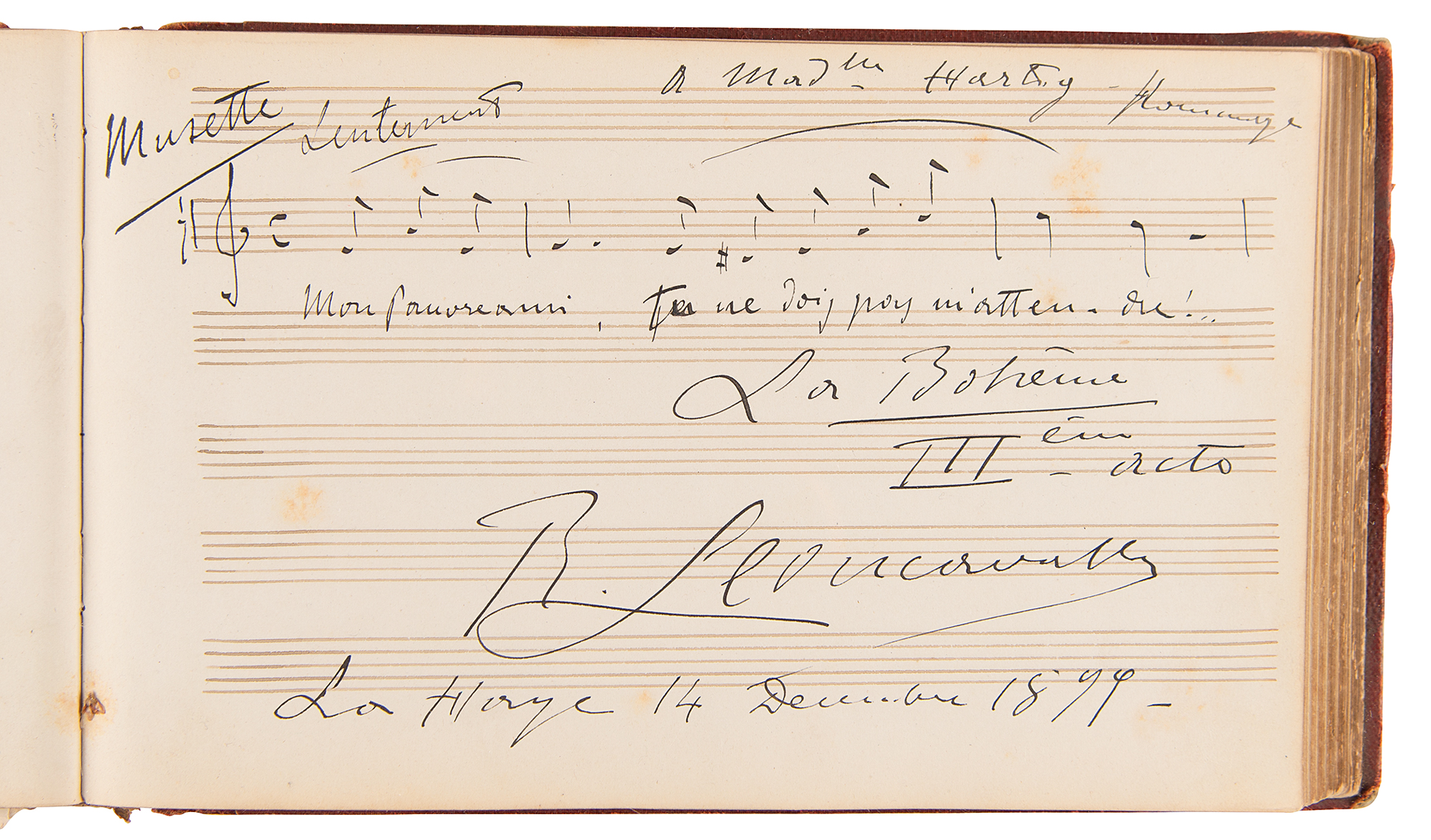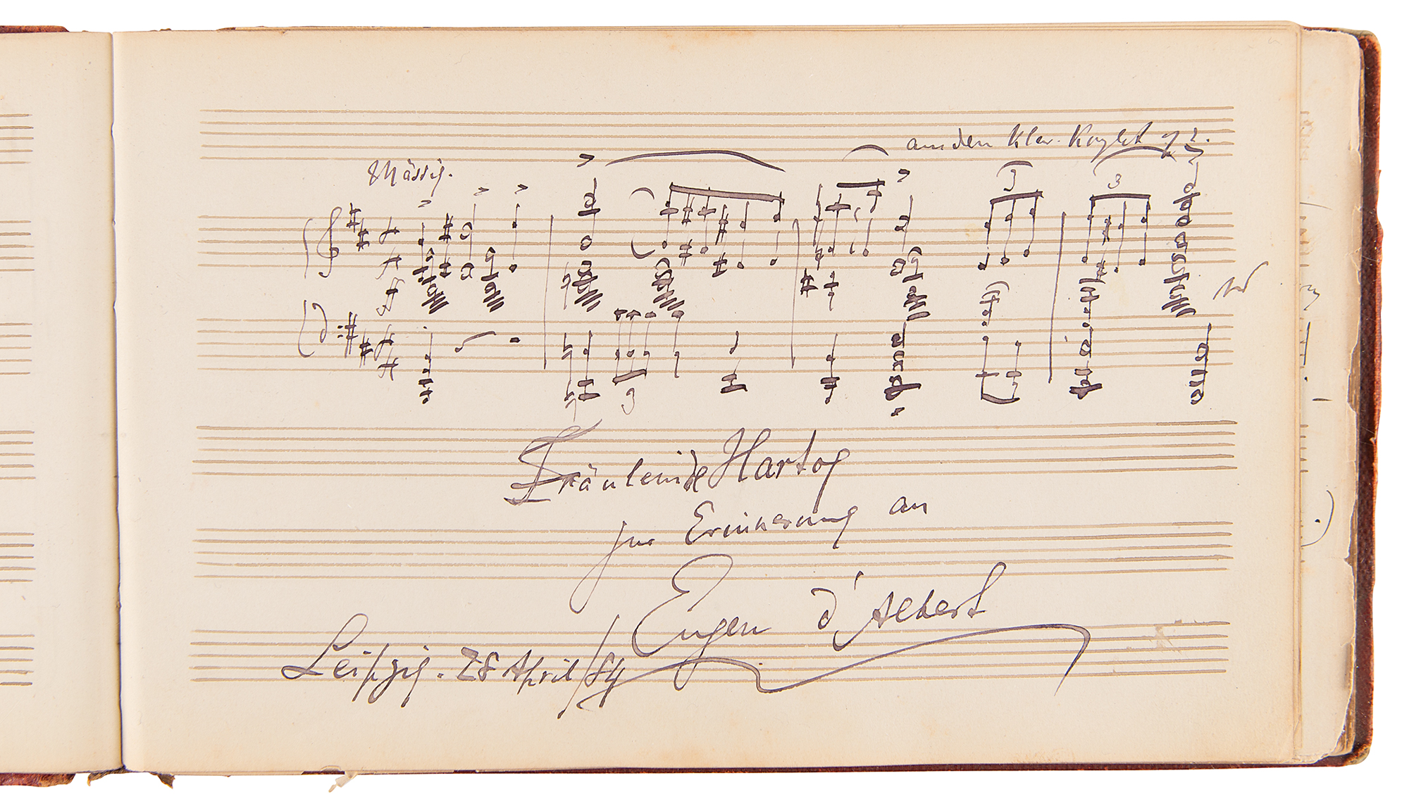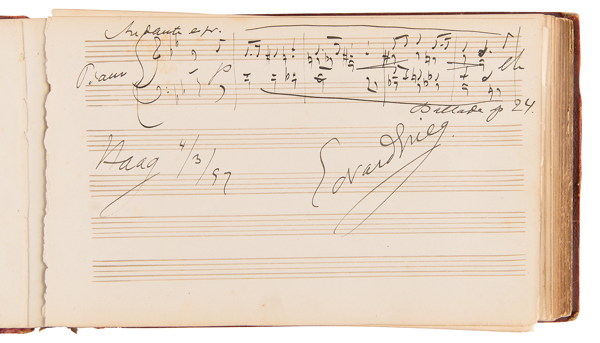 Marvelous leather-bound autograph album, 8.25 x 5, containing over 100 signed autograph musical quotations by popular composers and musicians from the late 1880s and early 1900s, a group highlighted by an exceptionally rare handwritten musical quotation from the great Russian Romantic composer Alexander Borodin, who signs his name an astounding three times, “A. Borodin,” adds several bars of music from a work entitled, “Der reizendsten 'Ersten Geige,’” and writes an inscription to “Fraulein Elise von Hartog…Antweren, 7th 1885.” Other standouts include musical quotations from Norwegian master Edvard Grieg, who writes 10 bars of music from his Ballade Opus 24, and Italian composer Ruggero Leoncavallo, who pens three bars from the third act of “La Boheme.” Additional quotations appear from Vincent D’Indy, Anton Rubinstein, Ignacy Padarewski, Pietro Mascagni, Arthur Nikisch, Carl Reinecke, Max Reger, Eugen d’Albert, Alexander Glazunov, Léo Delibes, Camille Saint-Saens, and many, many others. The front of the album page is gilt-titled with the name of the album’s owner, Elise de Hartog, the adopted daughter of the Dutch composer Edouard de Hartog (1826-1909). It seems that Hartog made a study tour starting in Amsterdam in 1880, which was later continued in Belgium and Germany. During this tour, she met numerous eminent musicians who all contributed to her ‘liber amicorum.’ In overall fine condition, with wear to the spine and covers, and three of the pages detached. A remarkable assemblage of classical luminaries made special by the presence of Alexander Borodin, who remains virtually unobtainable across all handwritten formats. Our research reveals no other example of an autograph musical quotation from the Russian composer.