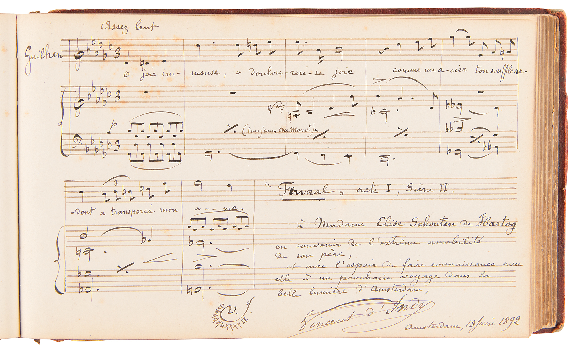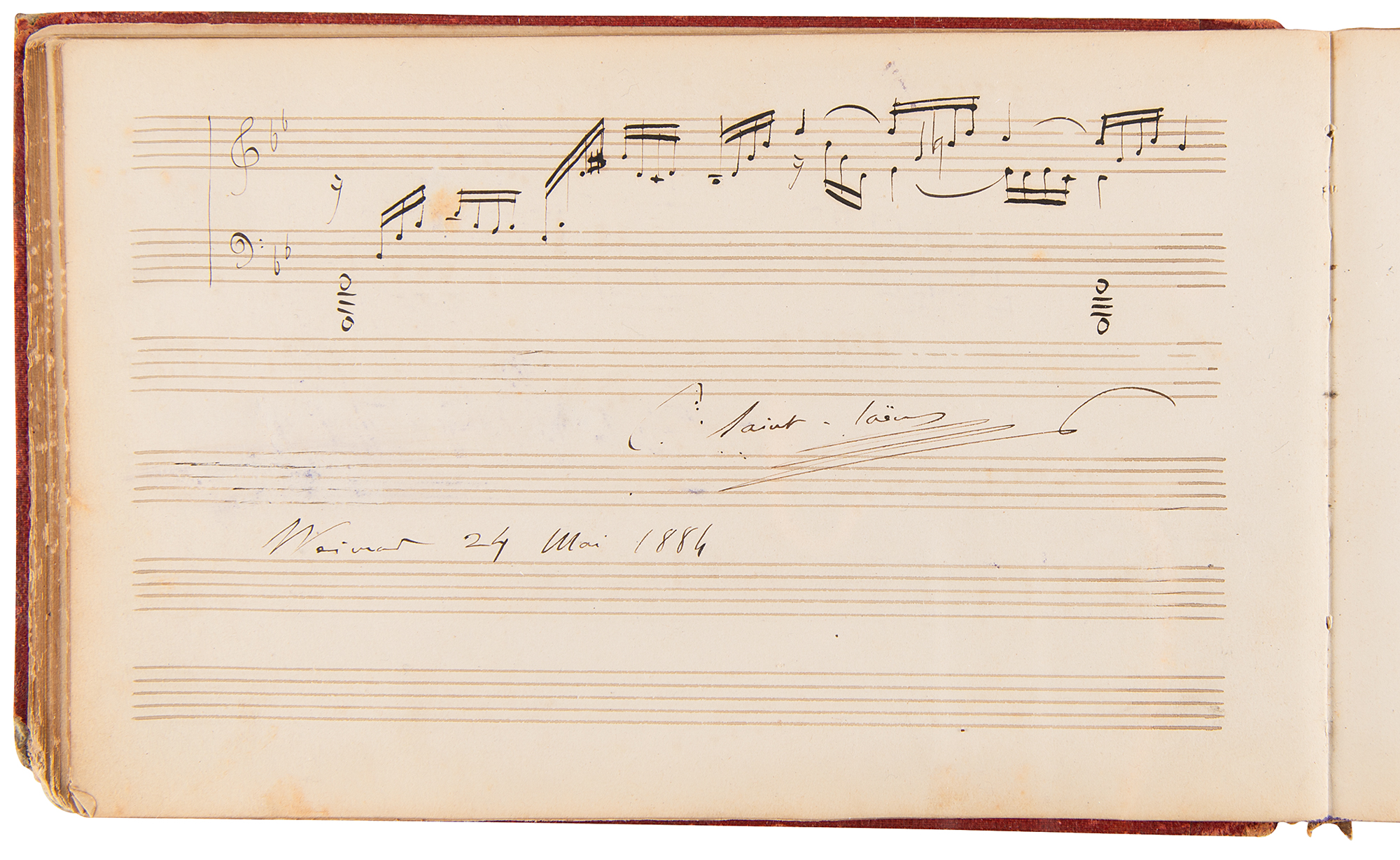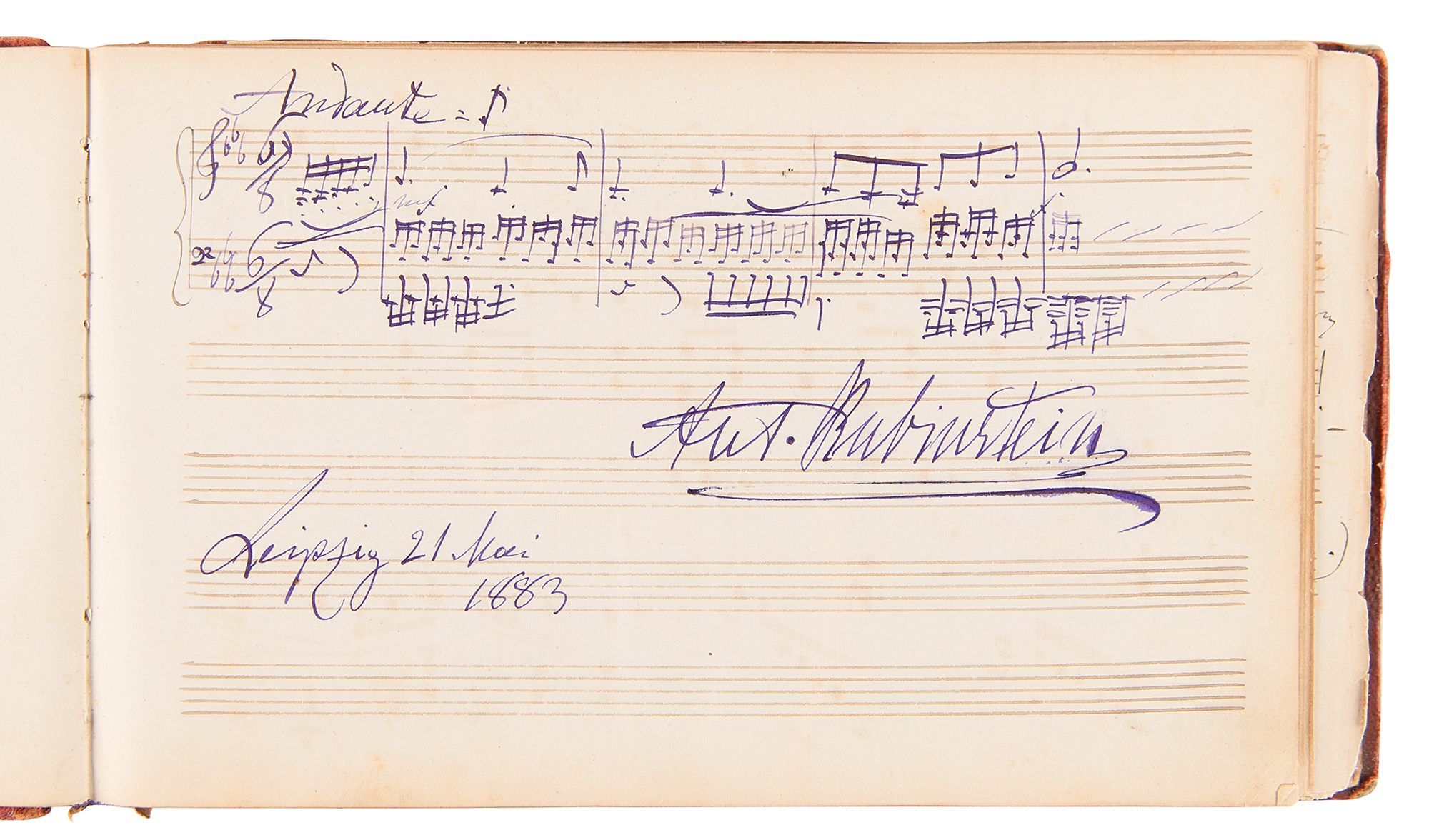 Marvelous leather-bound autograph album, 8.25 x 5, containing over 100 signed autograph musical quotations by popular composers and musicians from the late 1880s and early 1900s, a group highlighted by an exceptionally rare handwritten musical quotation from the great Russian Romantic composer Alexander Borodin, who signs his name an astounding three times, “A. Borodin,” adds several bars of music from a work entitled, “Der reizendsten 'Ersten Geige,’” and writes an inscription to “Fraulein Elise von Hartog…Antweren, 7th 1885.” Other standouts include musical quotations from Norwegian master Edvard Grieg, who writes 10 bars of music from his Ballade Opus 24, and Italian composer Ruggero Leoncavallo, who pens three bars from the third act of “La Boheme.” Additional quotations appear from Vincent D’Indy, Anton Rubinstein, Ignacy Padarewski, Pietro Mascagni, Arthur Nikisch, Carl Reinecke, Max Reger, Eugen d’Albert, Alexander Glazunov, Léo Delibes, Camille Saint-Saens, and many, many others. The front of the album page is gilt-titled with the name of the album’s owner, Elise de Hartog, the adopted daughter of the Dutch composer Edouard de Hartog (1826-1909). It seems that Hartog made a study tour starting in Amsterdam in 1880, which was later continued in Belgium and Germany. During this tour, she met numerous eminent musicians who all contributed to her ‘liber amicorum.’ In overall fine condition, with wear to the spine and covers, and three of the pages detached. A remarkable assemblage of classical luminaries made special by the presence of Alexander Borodin, who remains virtually unobtainable across all handwritten formats. Our research reveals no other example of an autograph musical quotation from the Russian composer.