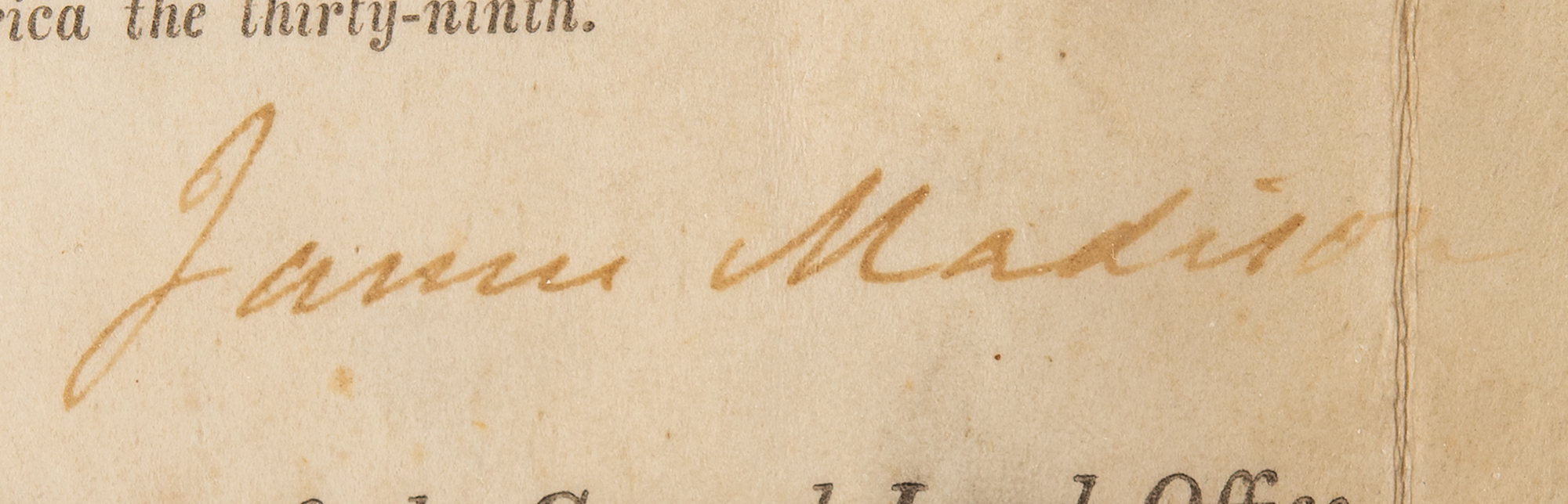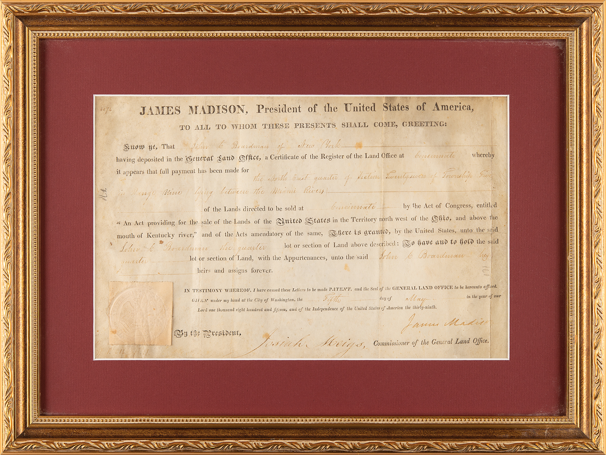 Partly-printed vellum DS as president, one page, 12.5 x 8, May 5, 1815. President Madison issues to “John C. Boardman of New York,” a tract of land in the “North East quarter of Section Twenty-seven of Township Five in Range Nine (lying between the Miami Rivers) of the Lands directed to be sold at Cincinnati by the act of Congress, entitled 'An act providing for the sale of the lands of the United States in the Territory north west of the Ohio, and above the mouth of Kentucky river.'" Signed neatly at the conclusion by President Madison, and countersigned by Commissioner of the General Land Office Josiah Meigs. The lower left retains the original embossed off-white seal. Matted and framed to an overall size of 18.5 x 14. In very good to fine condition, with toning, soiling, and a few small stains.