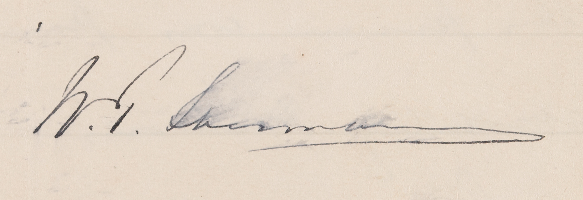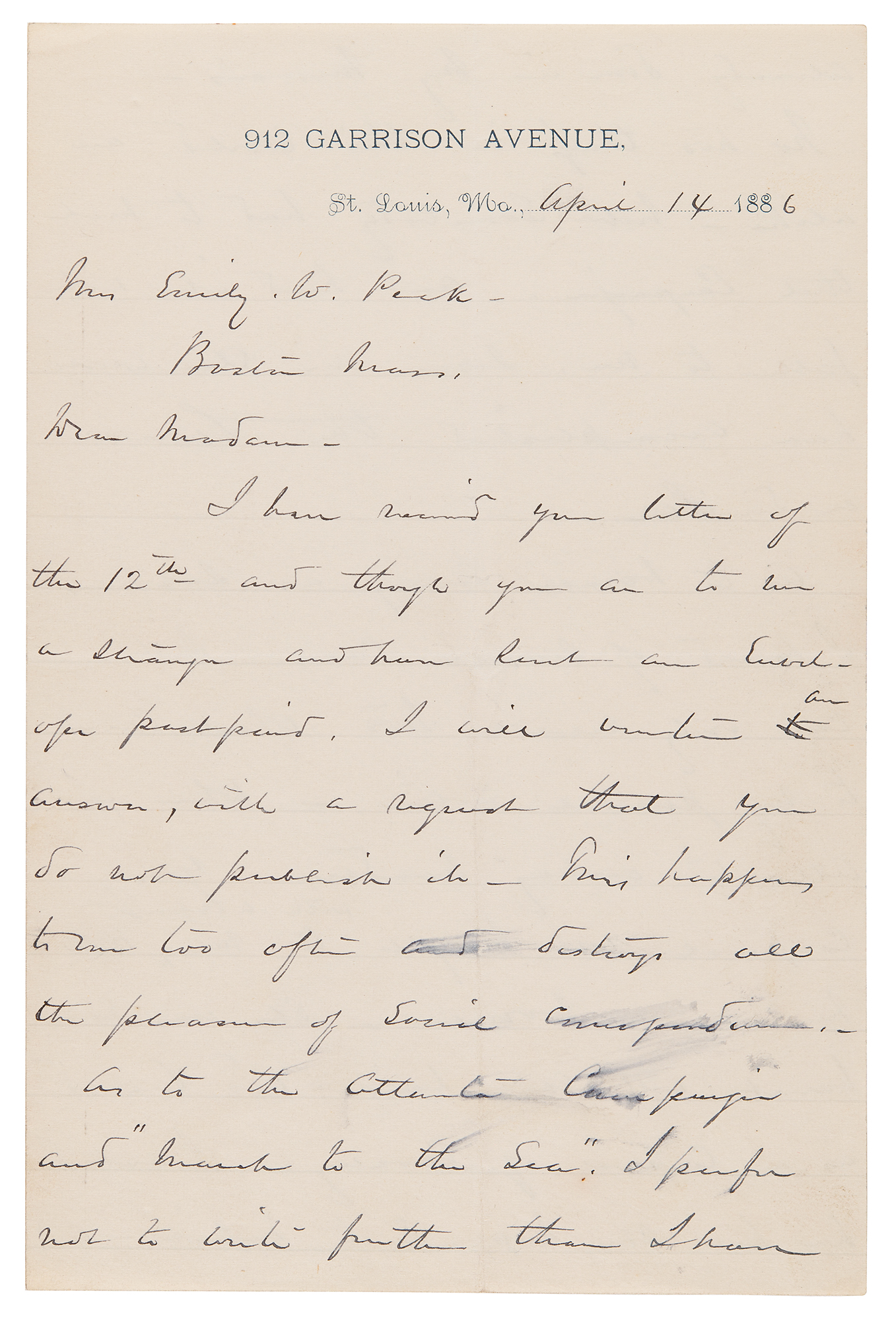 ALS signed “W. T. Sherman,” four pages on two adjoining sheets, 5.5 x 8.25, 912 Garrison Avenue letterhead, April 14, 1886. Handwritten letter to Emily W. Peck of Boston, with remarks on his heroic 'March to the Sea' and insightful commentary on the service of women during the Civil War. In part: "I have received your letter…and though you are to me a stranger and have sent an envelope postpaid, I will return an answer, with a request that you do not publish it. This happens to me too often and destroys all the pleasure of social correspondence. As to the Atlanta Campaign and 'March to the Sea,' I prefer not to write further than I have already done in my memoirs. No two things in this world are alike—but somebody had to make that Campaign. And had it not fallen to me, someone else would have accomplished the same or similar.