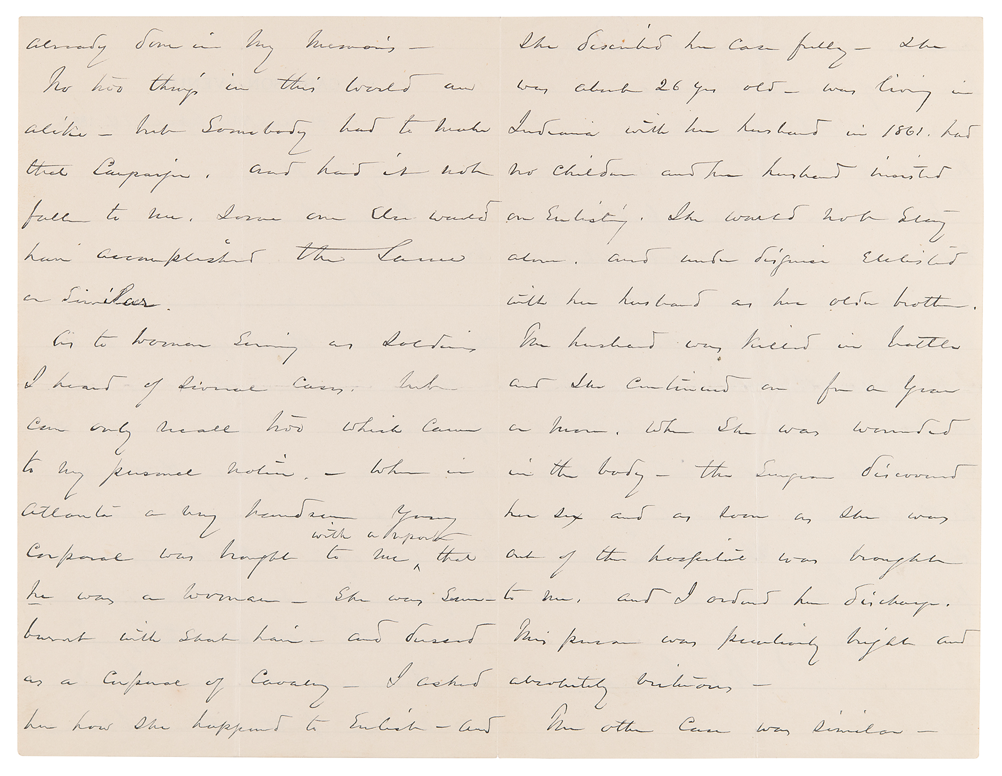 As to women serving as soldiers I heard of several cases, but can only recall two which came to my personal notice. When in Atlanta a very handsome young corporal was brought to me with a report that he was a woman. She was sun-burnt with short hair—and dressed as a corporal of Cavalry. I asked how she happened to enlist—and she described her case fully—she was about 26 yrs old, was living in Indiana with her husband in 1861, had no children and her husband insisted on enlisting. She would not stay alone, and under disguise enlisted with her husband as his older brother.