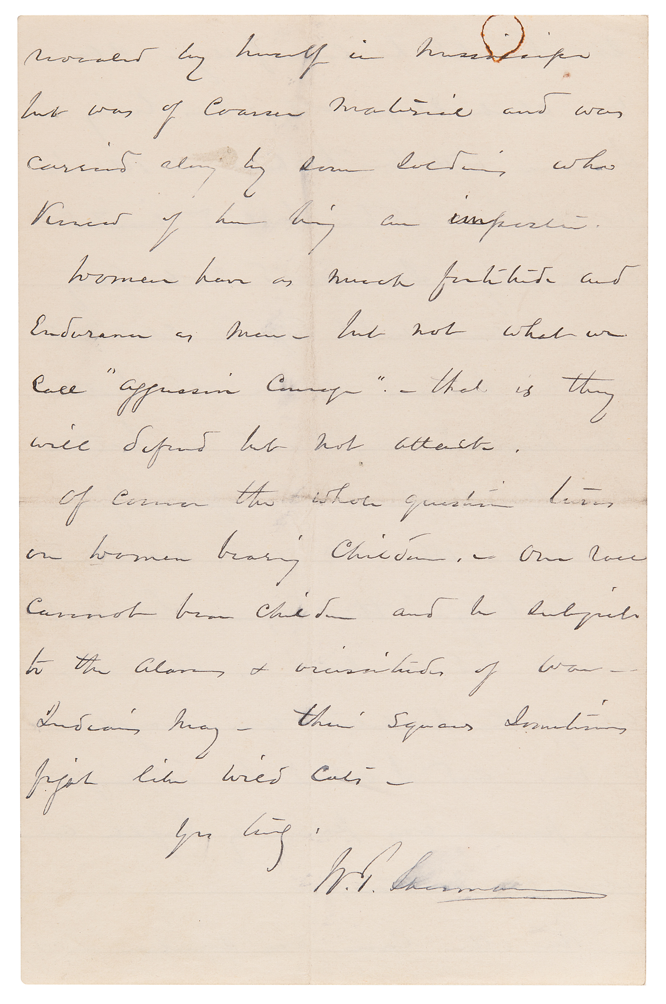 The husband was killed in battle and she continued on for a year or more. When she was wounded in the body—the surgeon discovered her sex and as soon as she was out of the hospital was brought to me, and I ordered her discharge. This person was peculiarly bright and absolutely virtuous. The other case was similar…Women have as much fortitude and endurance as men, but not what we call 'aggressive courage'—that is they will defend but not attack. Of course the whole question turns on women bearing children. Our race cannot bear children and be subject to the alarms & vicissitudes of war. Indians may—their squaws sometimes fight like wild cats." In overall fine condition, with some light brushing to ink and a rusty paperclip stain to the top edge.