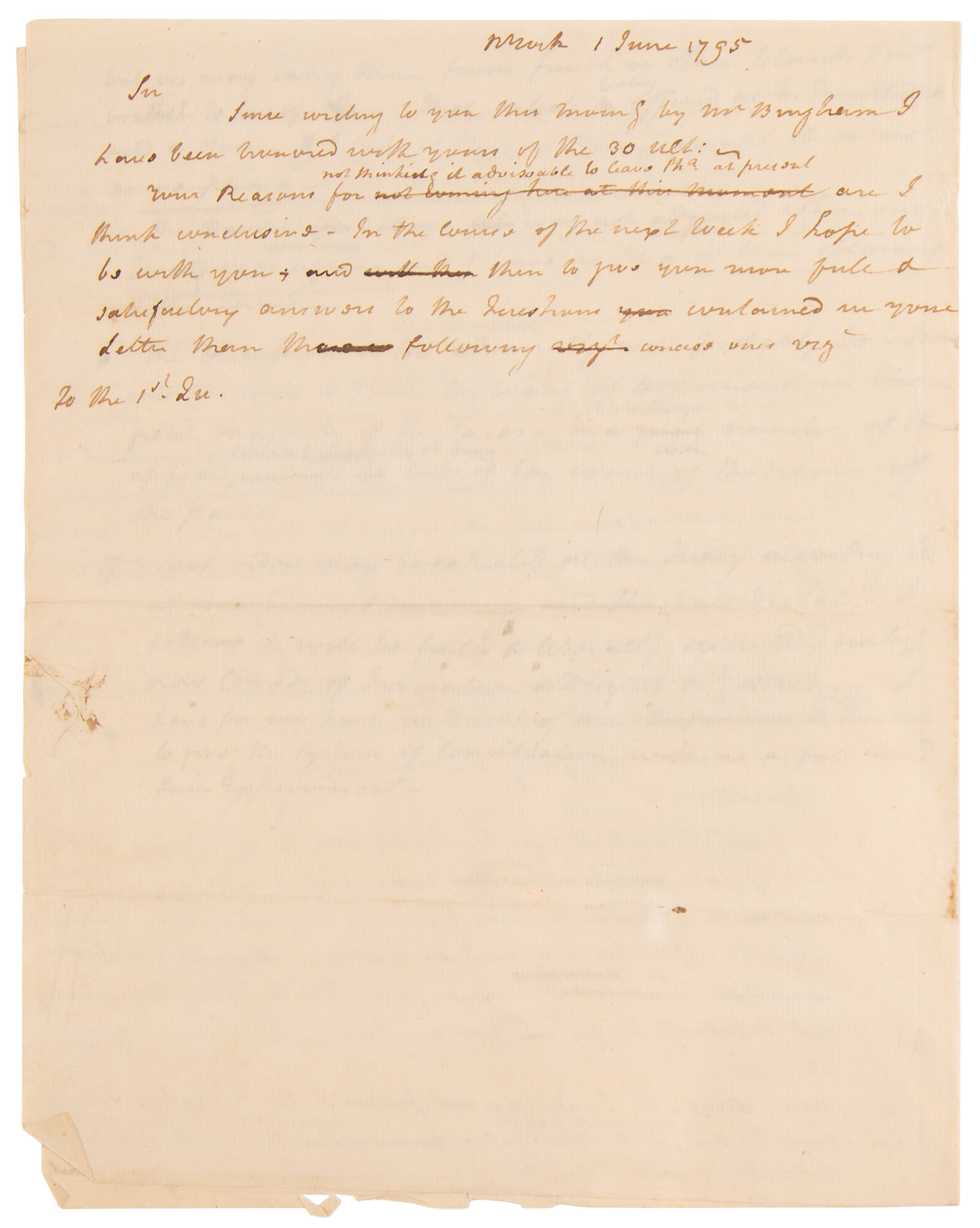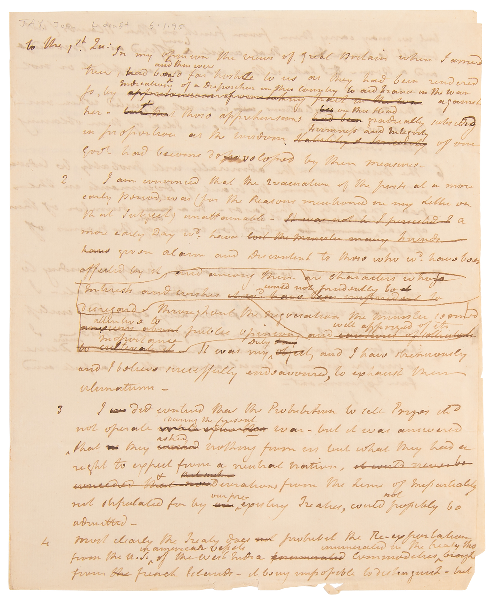Historic unsigned handwritten draft of a letter by John Jay, three pages on two adjoining sheets, 8 x 10, June 1, 1795. Handwritten draft giving his defense of his treaty with Great Britain, prior to its ratification by the United States Senate. In part: "Your reasons for not thinking it advisable to leave Philadelphia at present are I think conclusive. In the course of the next week I hope to be with you and then to give you more full and satisfactory answers to the questions contained in your letter than the following concise ones, viz.