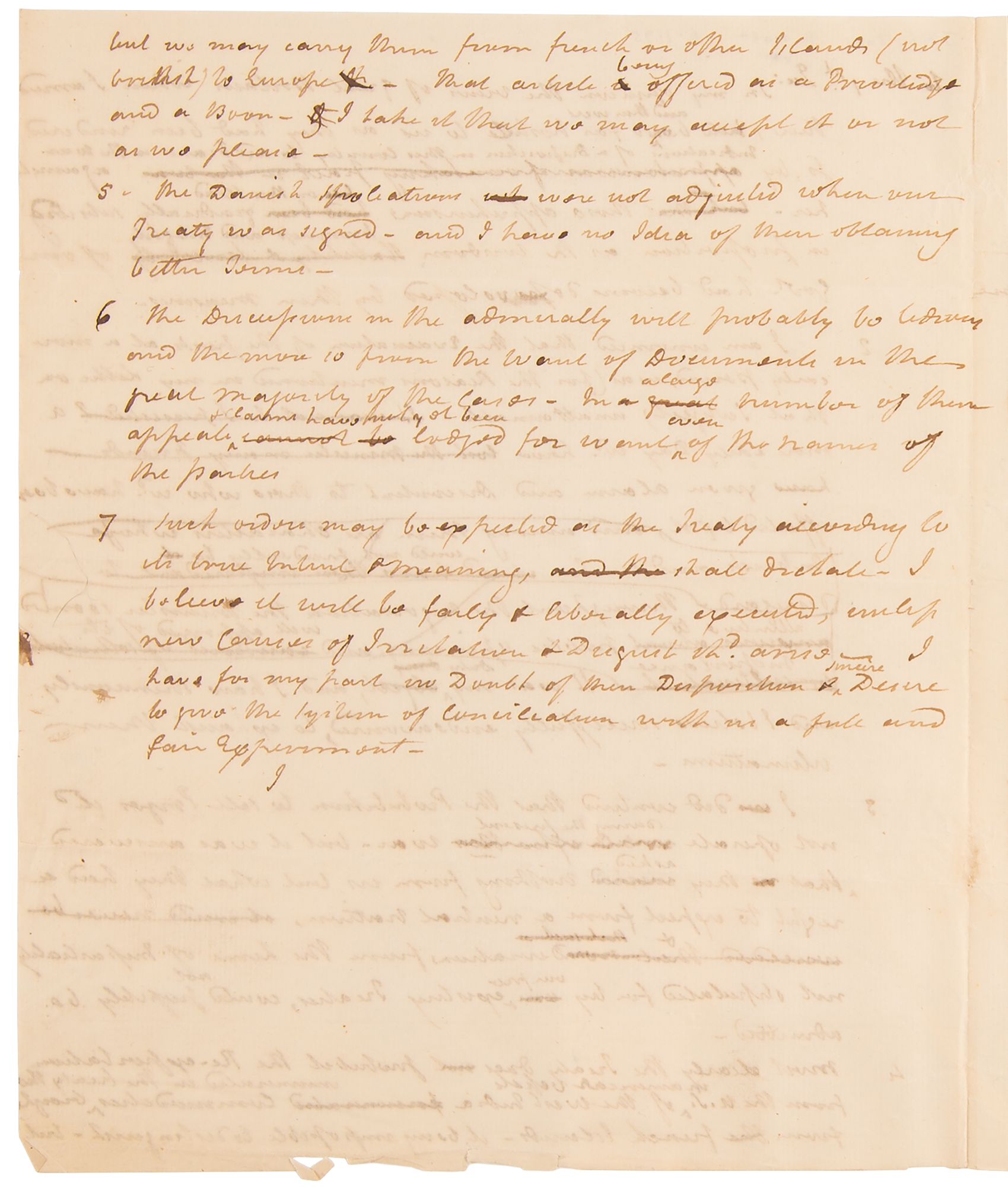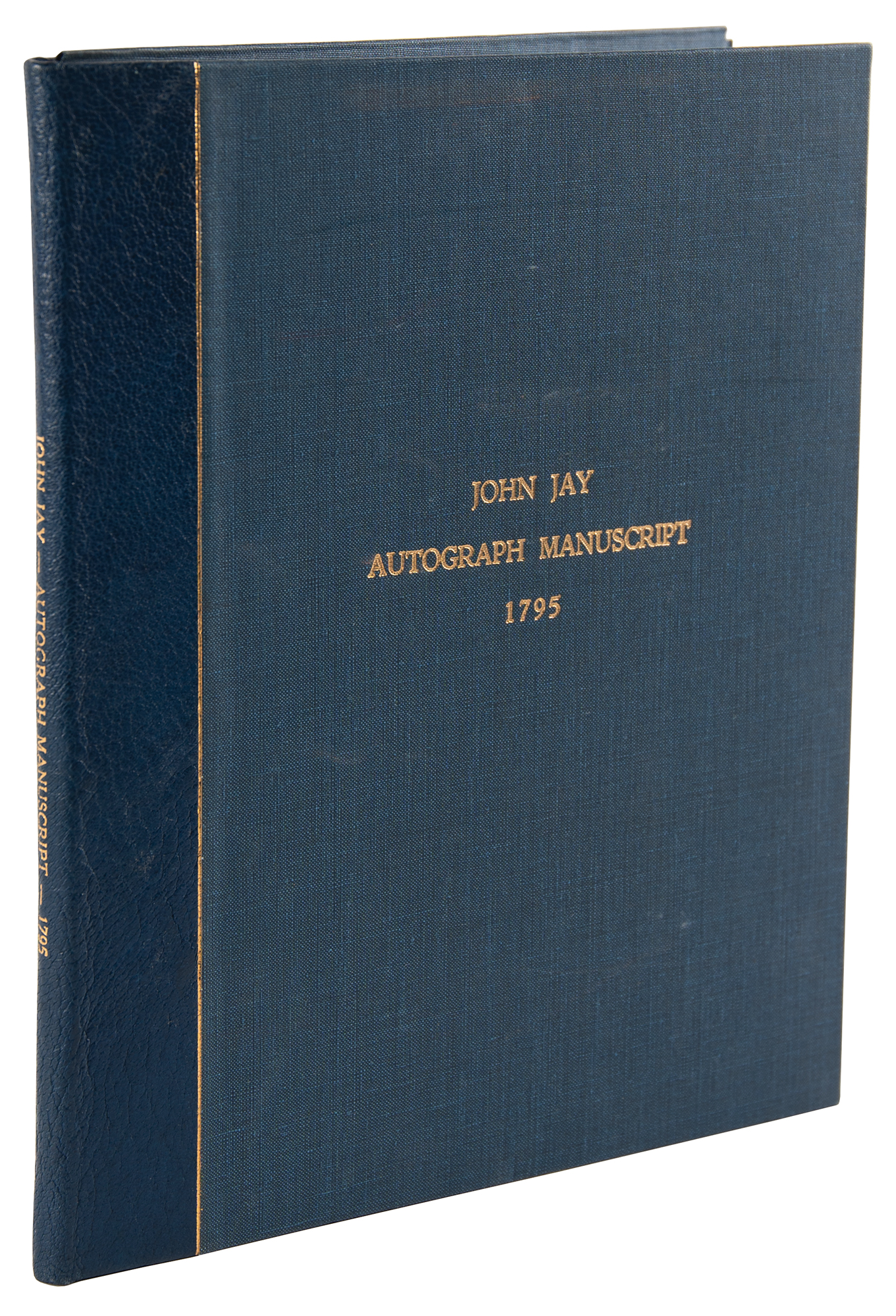 7. Such orders may be expected as the Treaty according to its true intent and meaning shall dictate. I believe it will be fairly and literally executed, unless new courses of irritation and disgust should arise. I have for my part no doubt of their disposition and sincere desire to give the system of conciliation with us a full and fair Experiment." Jay makes substantial revisions throughout the text, striking through and rewriting several lines. In fine condition. Accompanied by a custom-made quarter-leather presentation folder.