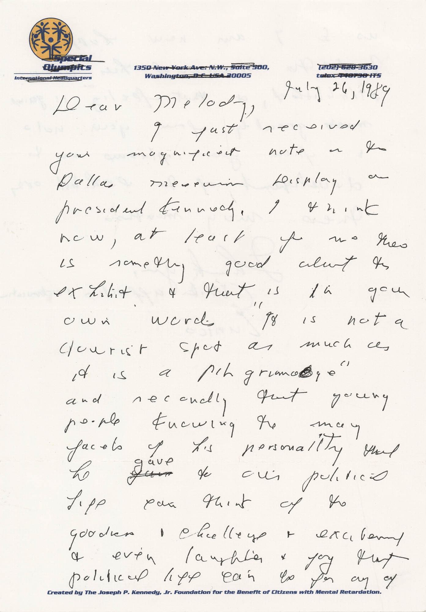 ALS signed “Eunice,” one page, 7.25 x 10.5, Special Olympics letterhead, July 26, 1989. Handwritten letter to Melody Miller, a close confidante of the Kennedy family and the deputy press secretary of Ted Kennedy, in full: “I just received your magnificent note on the Dallas Museum Display on President Kennedy. I think now, at least for us this is something good about the exhibit & that is in your own words ‘It is not a tourist spot as much as it is a pilgrimage’ and secondly that young people knowing the many facets of his personality that he gave to our political life can think of the goodness & challenge & excitement & even laughter & joy that political life can be for all of us. I am now happy that the memorial has been established, & that feeling is gained greatly from your note & from your explanation on & development of the exhibit over these many months.” In fine condition. Accompanied by the original mailing envelope addressed in the hand of Eunice Kennedy, who marks the contents as “Personal.”