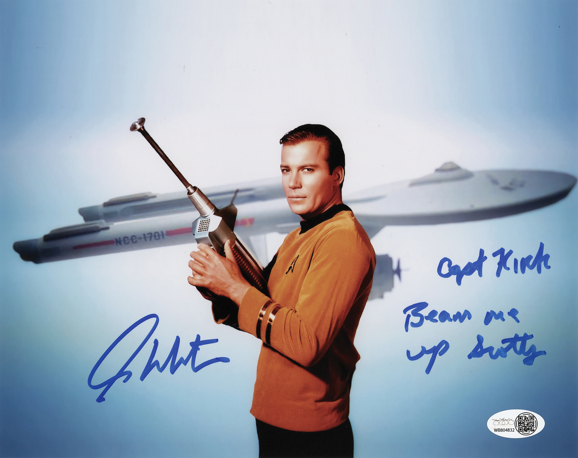 Color satin-finish 10 x 8 photo of William Shatner as Captain James T. Kirk from Star Trek, with an image of the Enterprise visible in the background, signed in blue felt tip by Shatner, who adds "Capt Kirk, Beam me up Scotty." In very fine condition, with a JSA label affixed to the lower right corner.