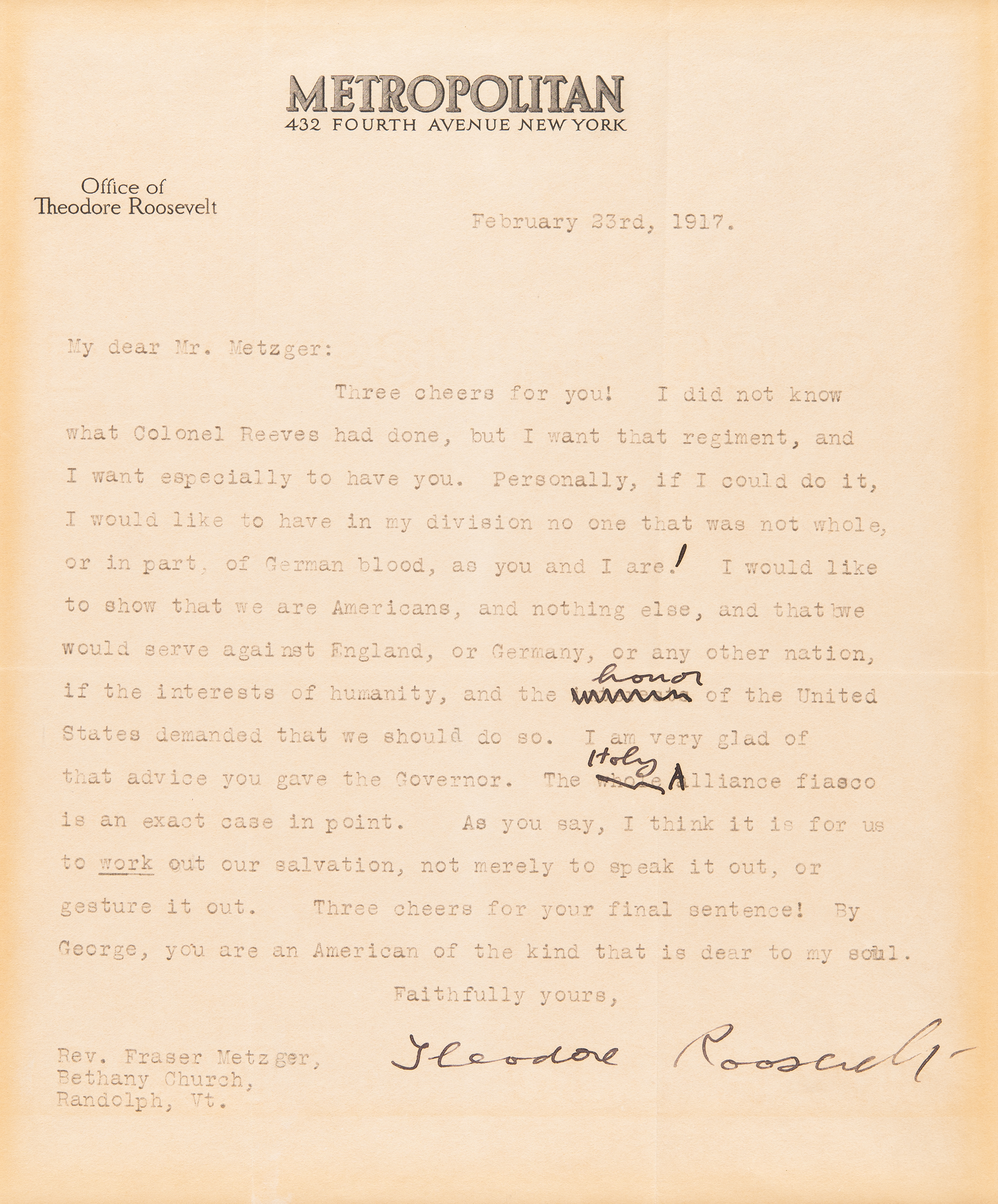 TLS, one page, 7.5 x 9.5, personal Metropolitan letterhead, February 23, 1917. Letter to Rev. Fraser Metzger of Bethany Church, in full: “Three cheers for you! I did not know what Colonel Reeves had done, but I want that regiment, and I want especially to have you. Personally, if I could do it, I would like to have in my division no one that was not whole, or in part, of German blood, as you and I are! I would like to show that we are Americans, and nothing else, and that we would serve against England, or Germany, or any other nation, if the interests of humanity, and the honor of the United States demanded that we should do so. I am very glad of that advice you gave the Governor. The Holy Alliance fiasco is an exact case in point. As you say, I think it is for us to work out our salvation, not merely to speak it out, or gesture it out. Three cheers for your final sentence! By George, you are an American of the kind that is dear to my soul.” Matted to a slightly larger size and in very good to fine condition, with some toning and corner mounting remnants matted out.