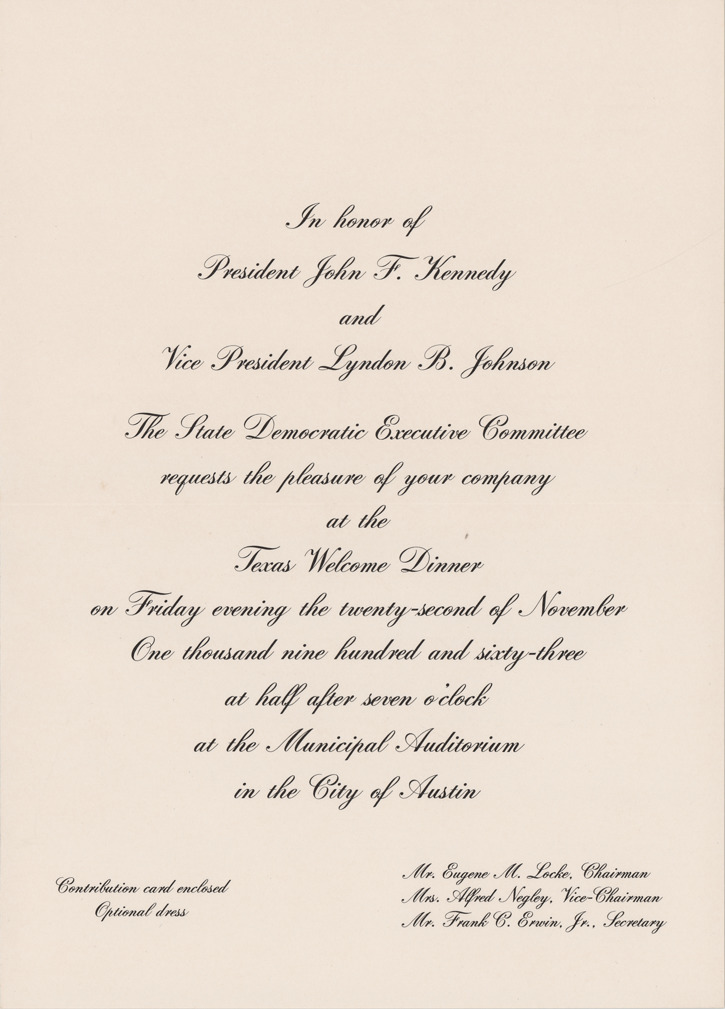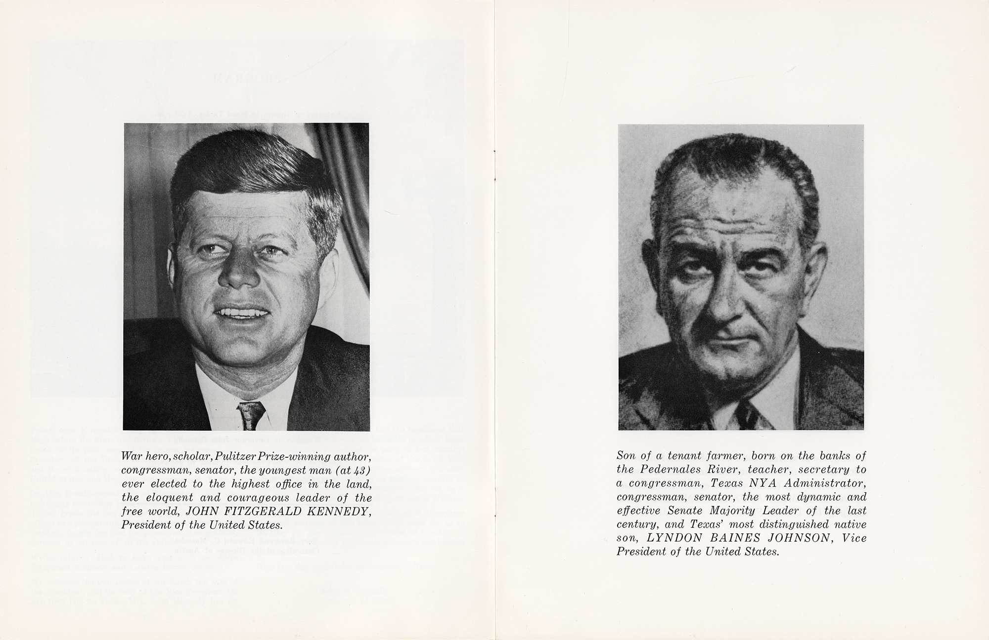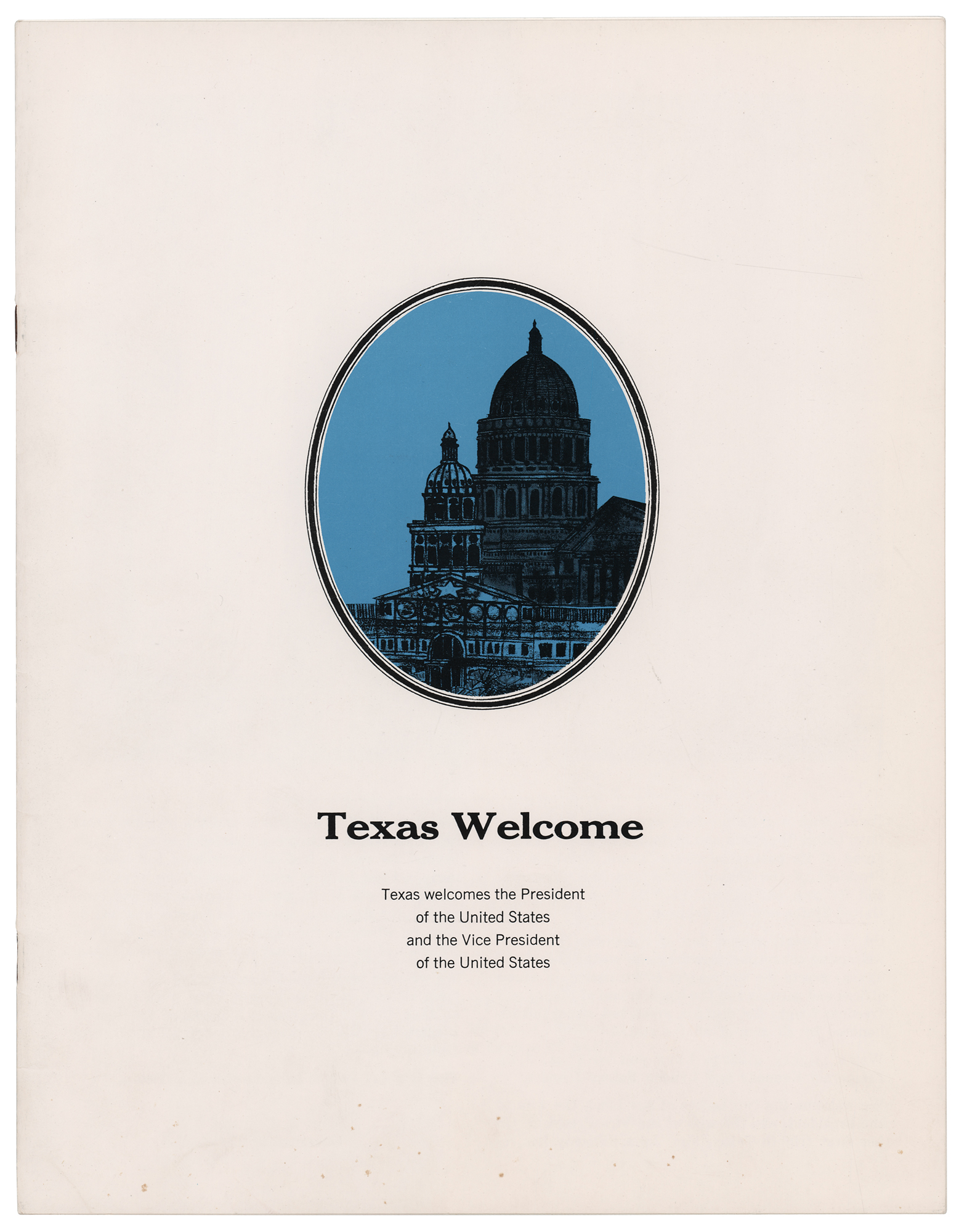 Two scarce 'Texas Welcome' items: an original souvenir program booklet for the 'Texas Welcome' dinner to be held at the Municipal Auditorium in Austin, Texas, on November 22, 1963, 8.5 x 11, 16 pages, containing brief biographies of the guests plus local advertisements; and a 7 x 9.75 invitation for the dinner, scheduled for November 22, 1963, at 7:30 PM. In overall fine condition.