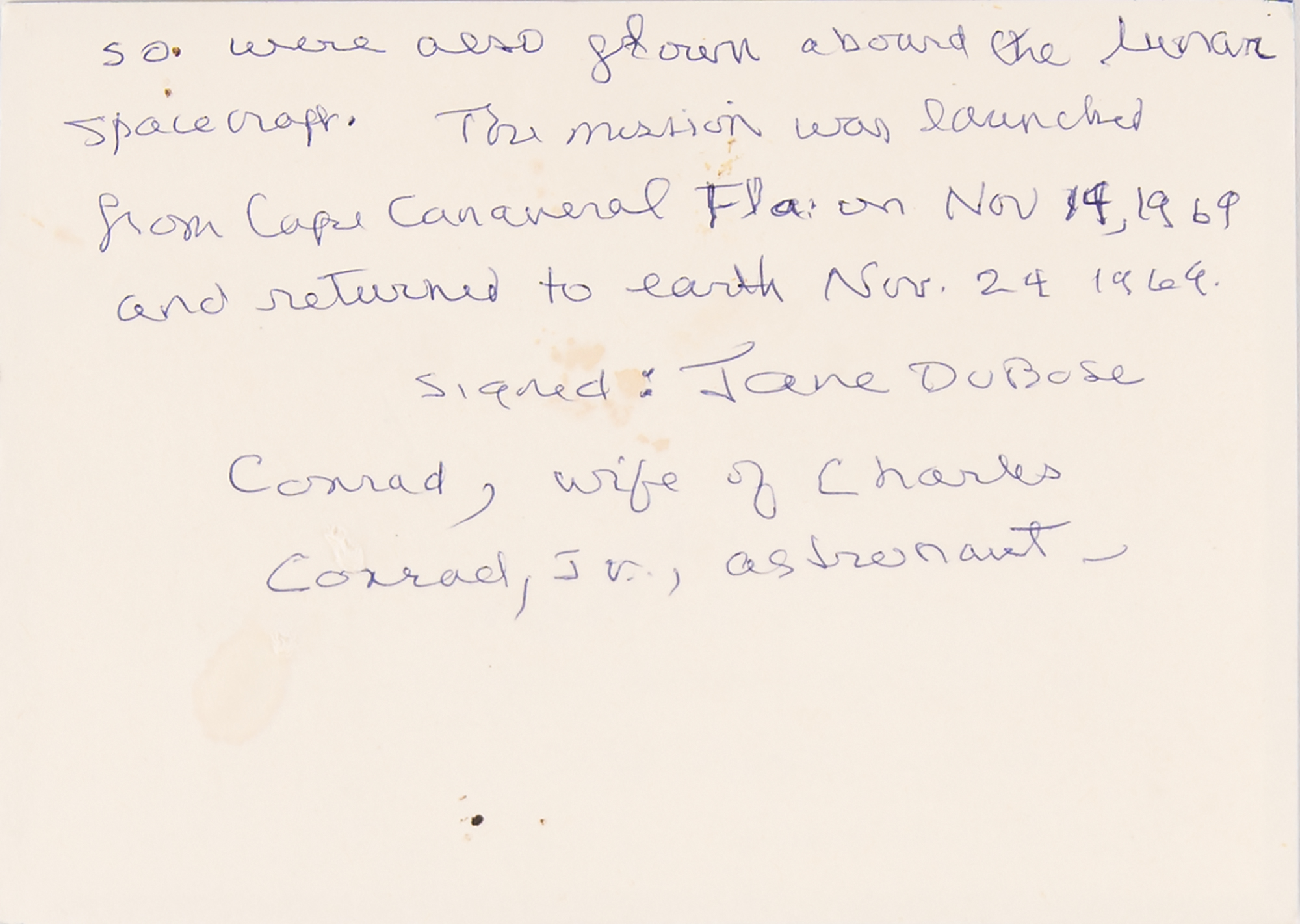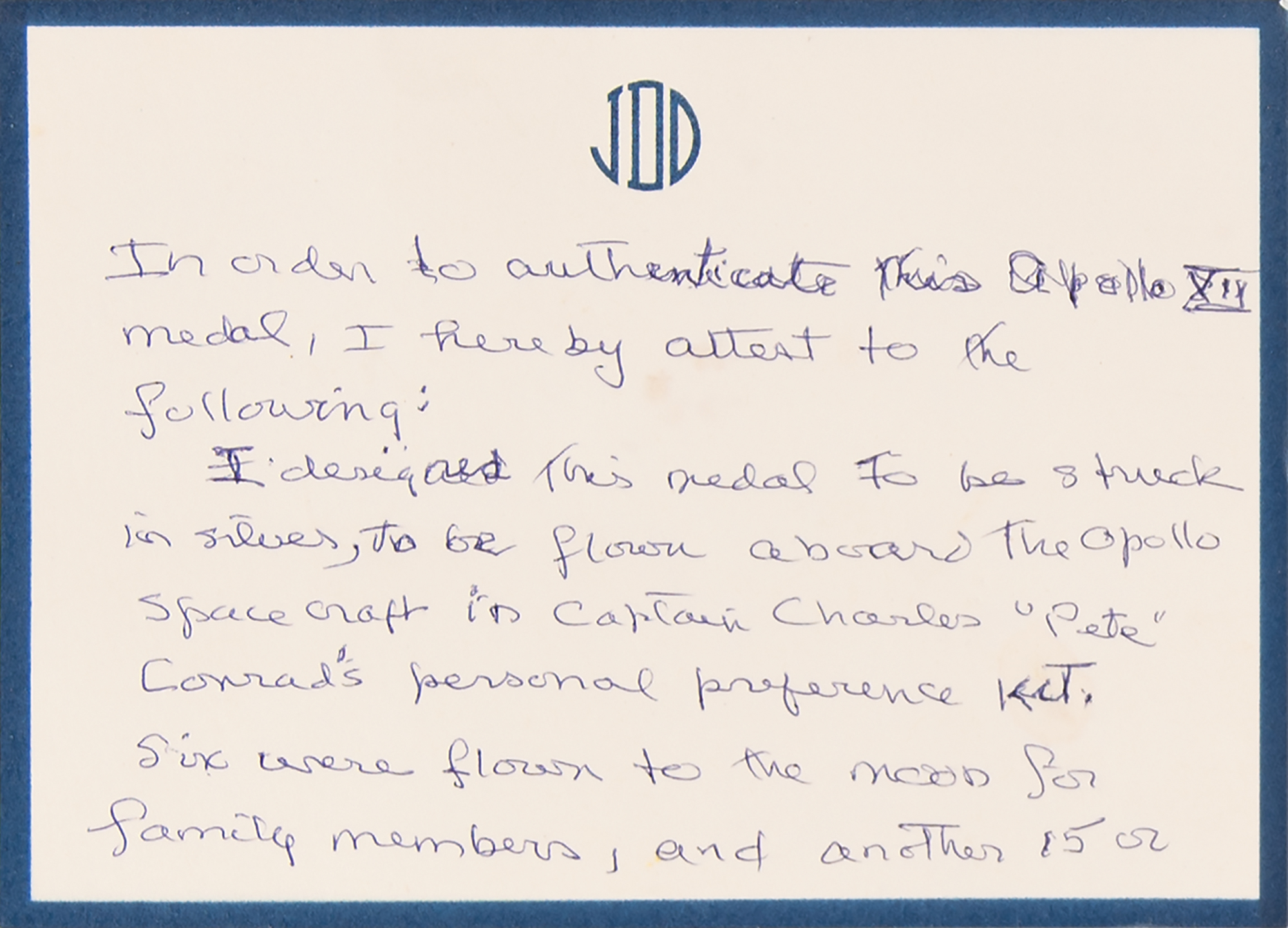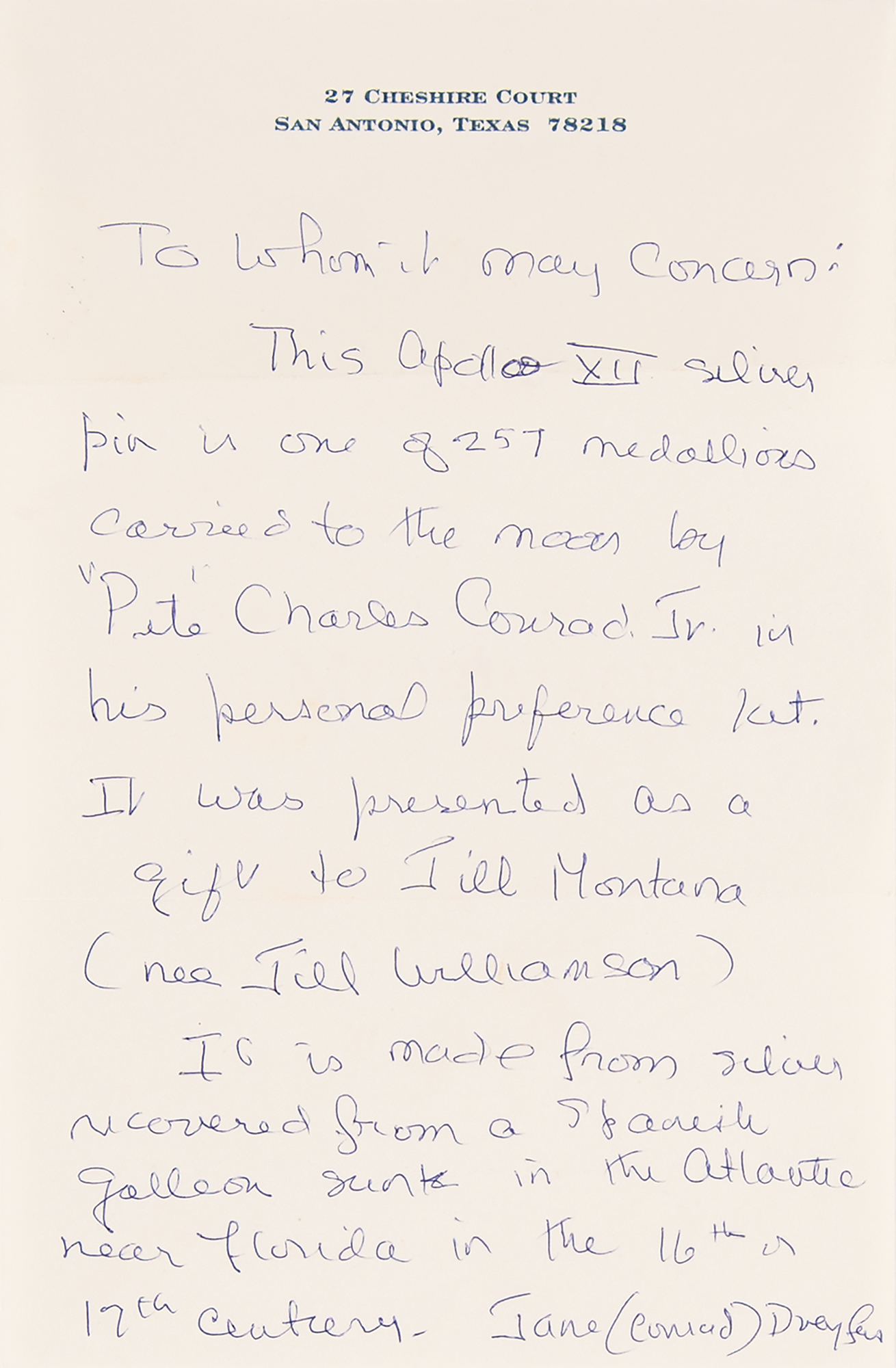 This example was presented to a friend by Conrad's wife, Jane (née DuBose), and is accompanied by two handwritten letters of provenance signed by her. One, in part: "This Apollo XII silver pin is one…carried to the moon by 'Pete' Charles Conrad Jr. in his personal preference kit…It is made from silver recovered from a Spanish galleon sunk in the Atlantic near Florida."