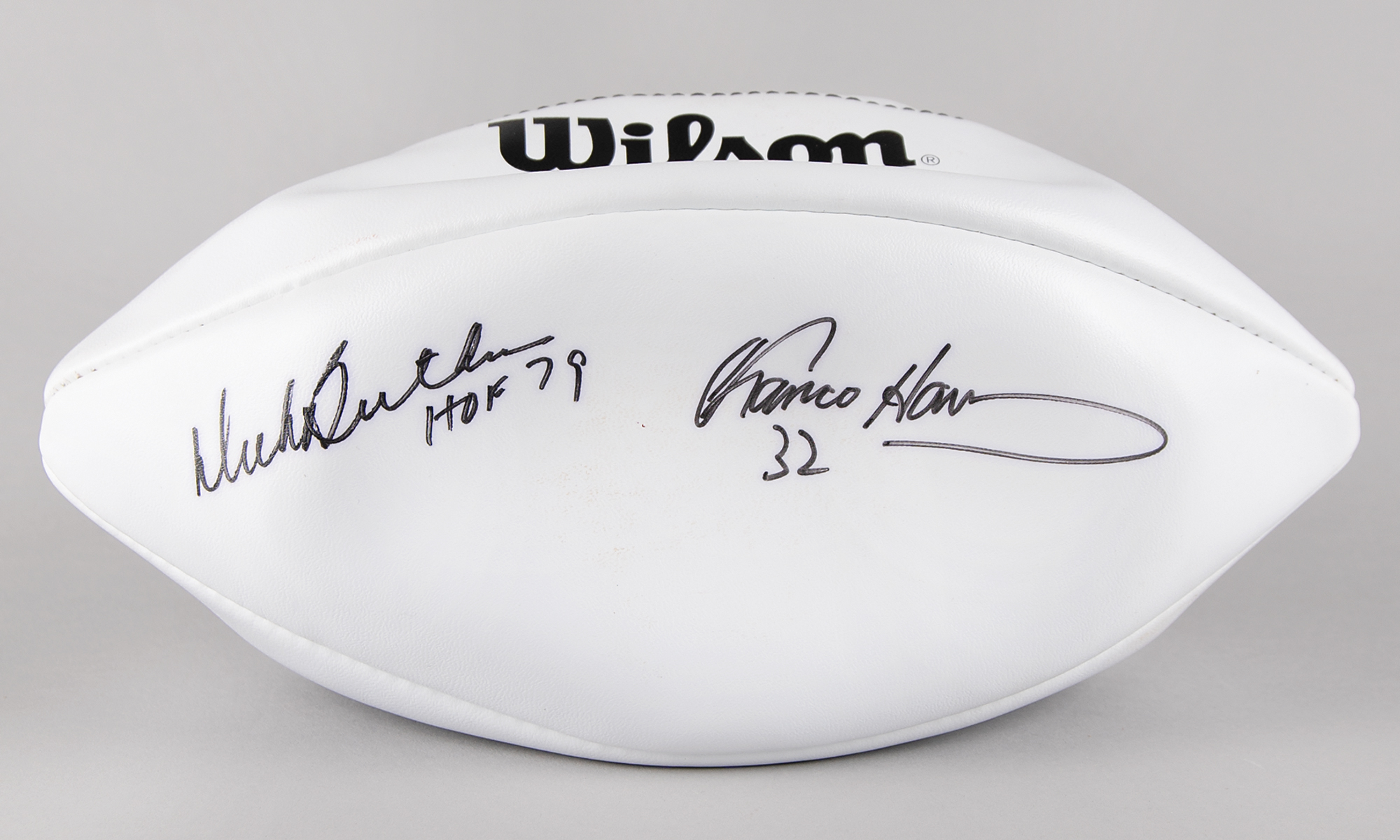 Official Wilson NFL football signed on a lower white panel in black felt tip by the two Pro Football Hall of Famers, “Dick Butkus, HOF 79” and “Franco Harris, 32.” In fine condition.