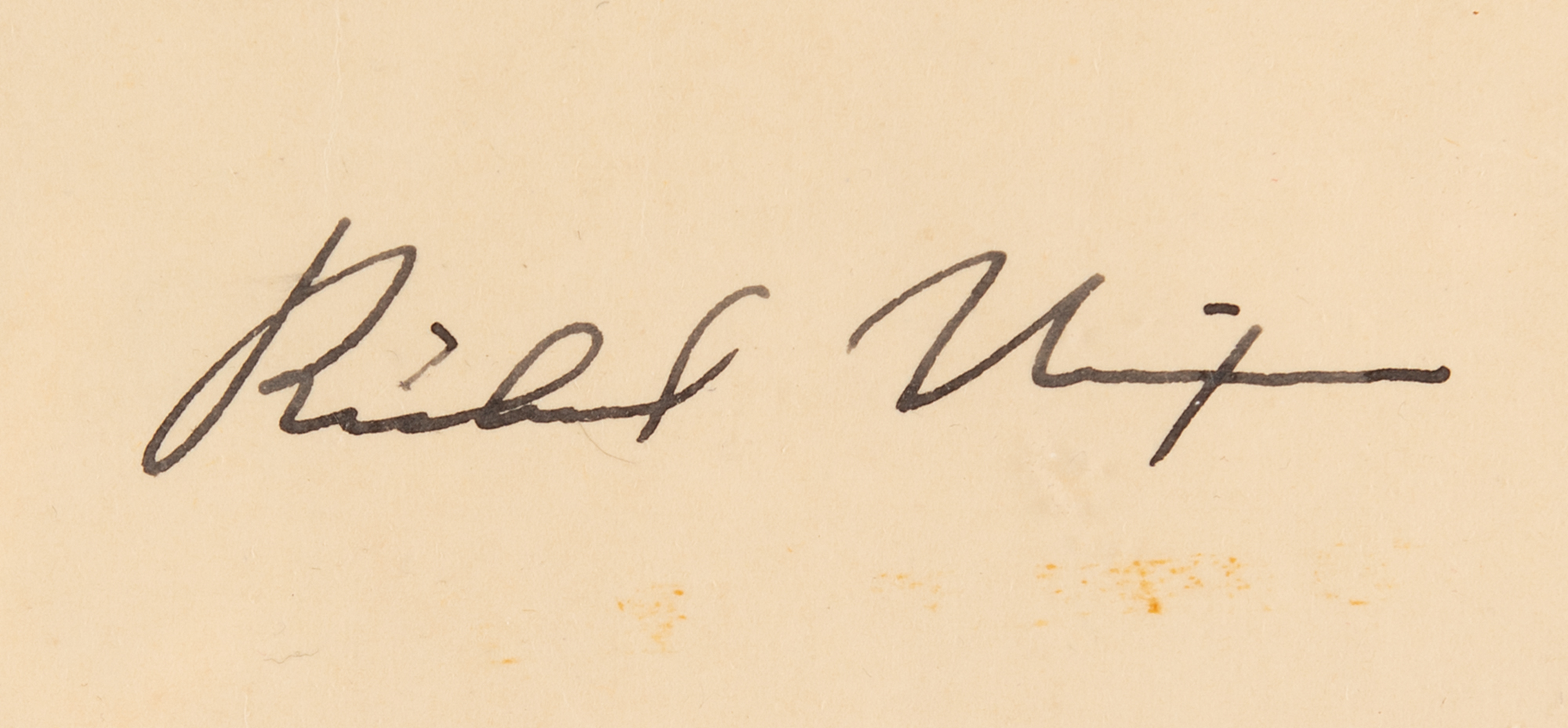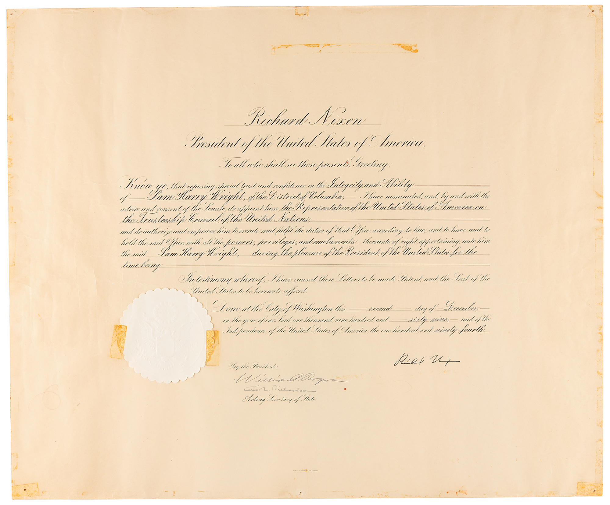 Partly-printed DS as president, one page, 23 x 19, December 2, 1969. President Nixon appoints Sam Harry Wright of the District of Columbia as “the Representative of the United States of America on the Trusteeship Council of the United Nations.” Signed at the conclusion by Richard Nixon, and countersigned by William P. Rogers as Secretary of State, and by Elliot L. Richardson served as Acting Secretary of State. The lower left retains the original large wafer seal. Rolled and in very good to fine condition, with creasing, tack holes to the edges, and some old tape stains (two of which touch the edges of the seal).