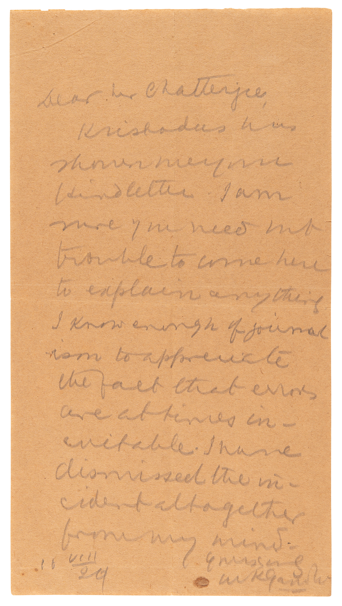 ALS in pencil, signed “M. K. Gandhi,” one page, 4.75 x 8.75, August 10, 1929. Thoughtful handwritten letter to A. C. Chatterjee, a journalist with the Associated Press of India, accepting an apology in respect to a mistake that was made in a publication. In full: "Krishadus has shown me your kind letter. I am sure you need not trouble to come here to explain anything. I know enough of journalism to appreciate the fact that errors are at times inevitable. I have dismissed the incident altogether from my mind." In fine condition, with uniform toning and a tiny stain toward the bottom edge.