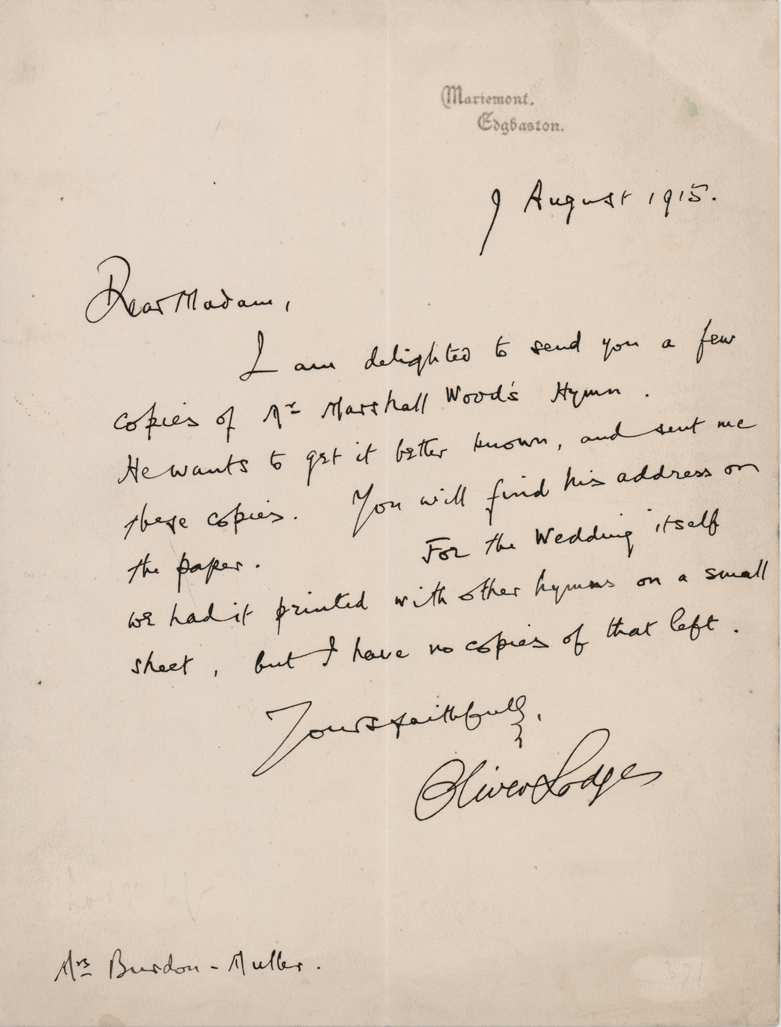 British physicist and writer (1851–1940) who held patents for key radio technologies and identified electromagnetic radiation independent of Hertz's proof. ALS, one page, 6.75 x 9, Mariemont letterhead, August 9, 1915. Handwritten letter to Mrs. Burdon-Muller, in full: "I am delighted to send you a few copies of Mr. Marshall Wood's Hymn. He wants to get it better known, and sent me these copies. You will find his address in the paper. For the Wedding itself we had it printed with other hymns on a small sheet, but I have no copies of that left." In fine condition, with a central vertical fold.