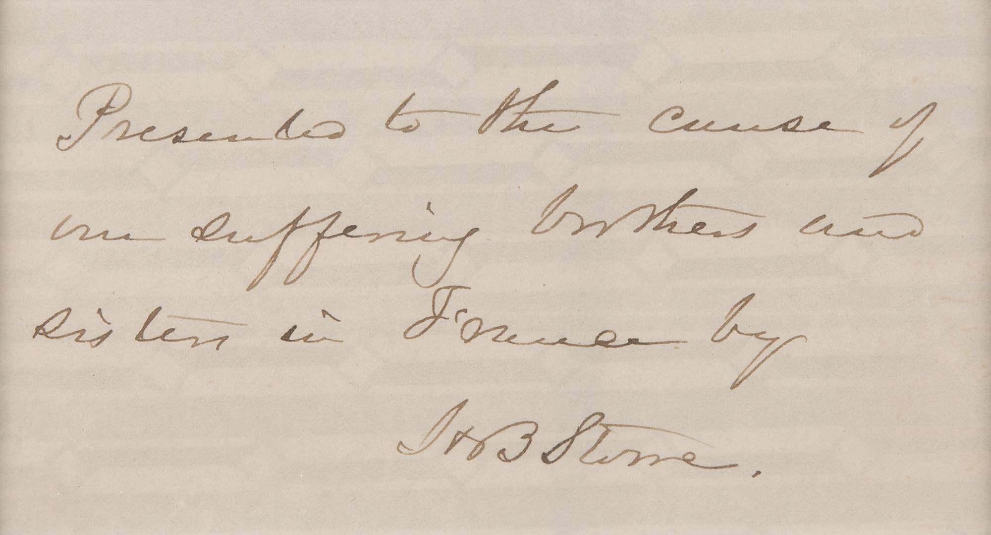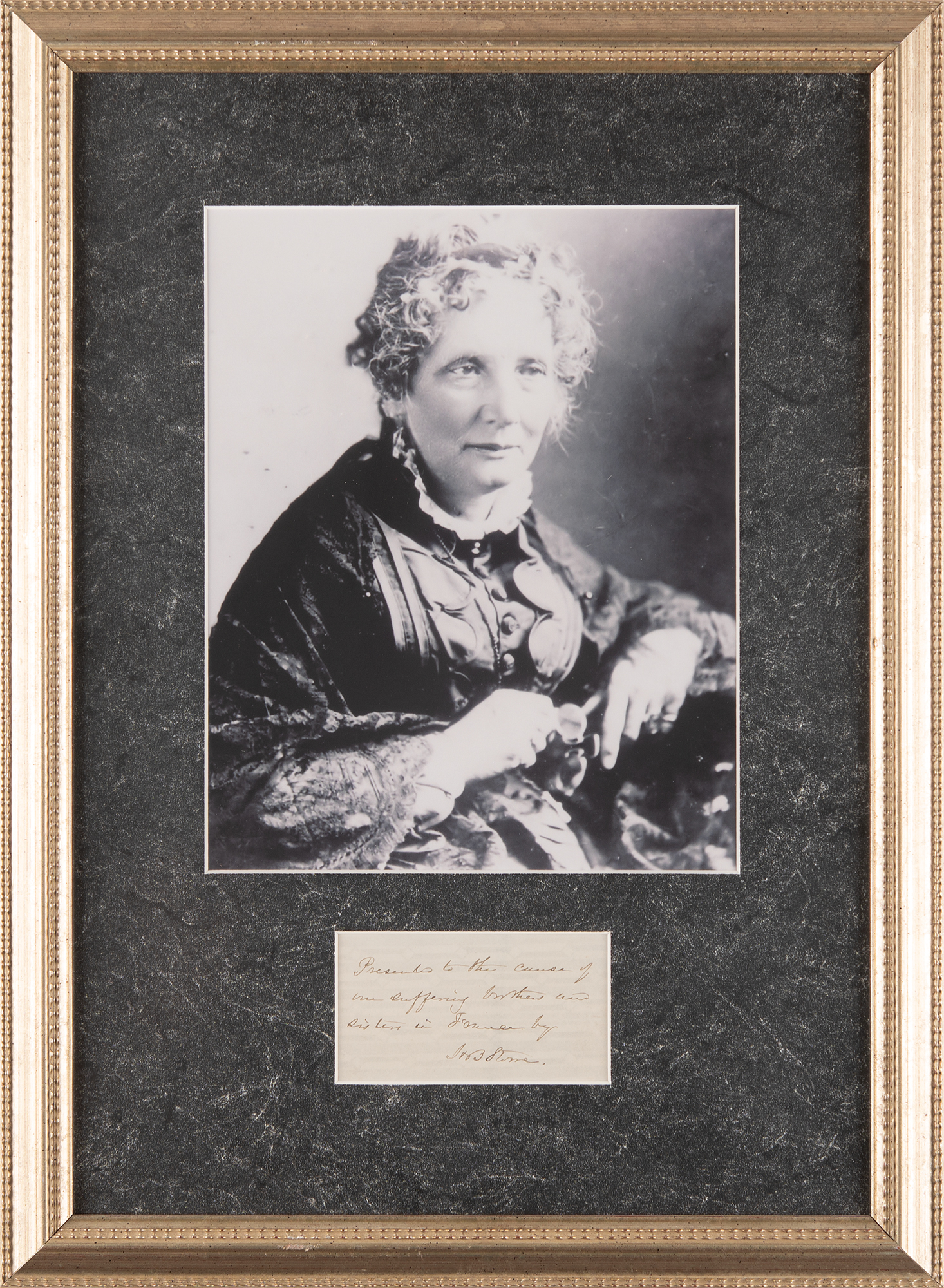Ink signature of Harriet Beecher Stowe, "Presented to the cause of our suffering brothers and sisters in France by H. B. Stowe,” on an off-white 4 x 2 sheet. Archivally matted and framed with a portrait to an overall size of 14 x 19. In fine condition.