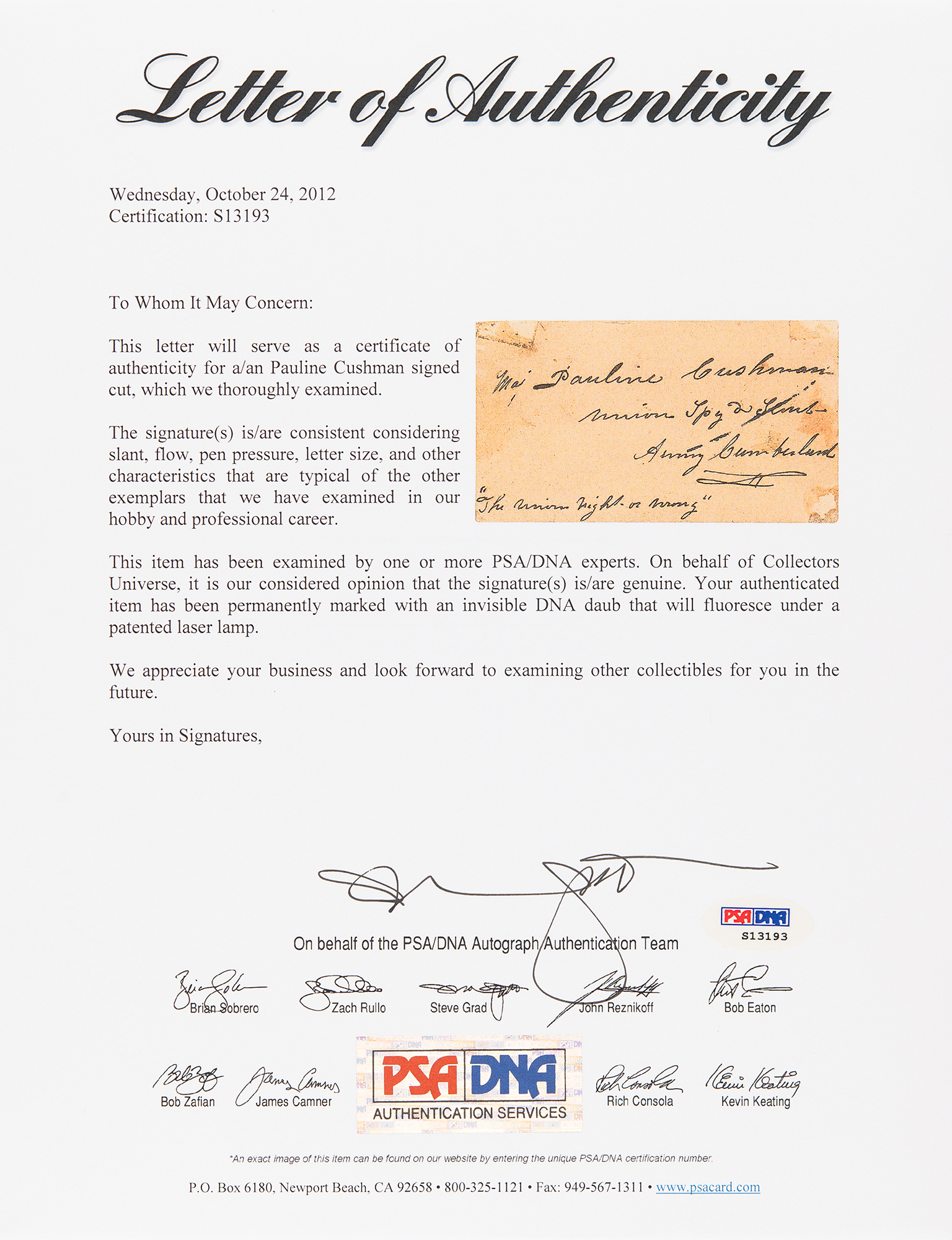 American actress and a spy (1833-1893) for the Union Army during the American Civil War, who is considered one of the most successful Civil War spies. Rare ink signature, “Maj. Pauline Cushman, Union Spy & Scout, Army Cumberland, ‘The Union right or wrong,’” on an off-white 3.25 x 1.75 card. Double-matted and framed with two portraits of Cushman to an overall size of 17.25 x 18.75. In very good to fine condition, with small stains, and old adhesive residue, and associated surface loss, at the corners. Accompanied by a full letter of authenticity from PSA/DNA.