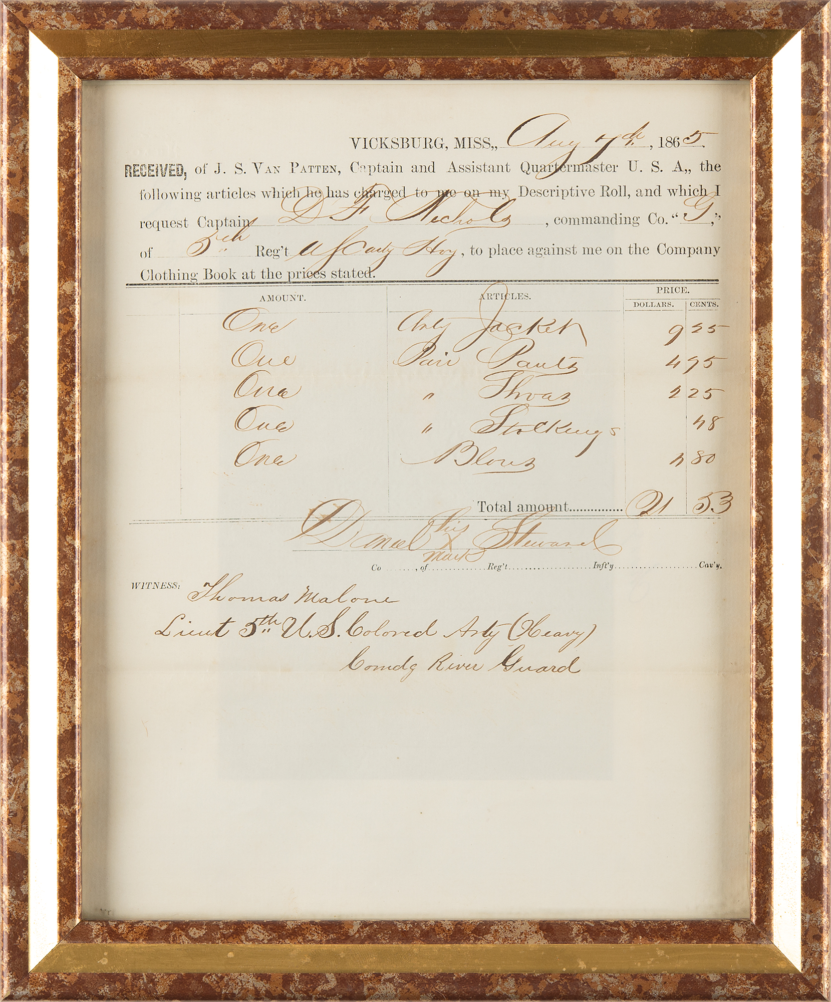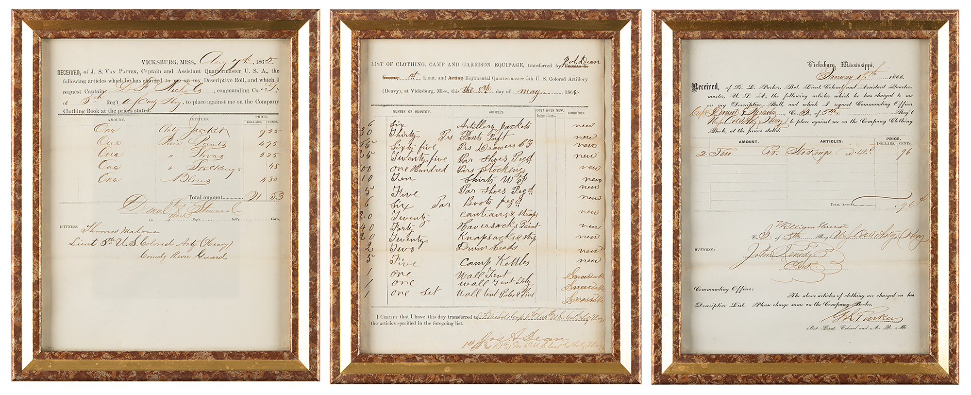 Three documents pertaining to the 5th United States Colored Heavy Artillery Regiment, issued at Vicksburg in 1865 and 1866, all framed to 9.25 x 11.5. Includes: