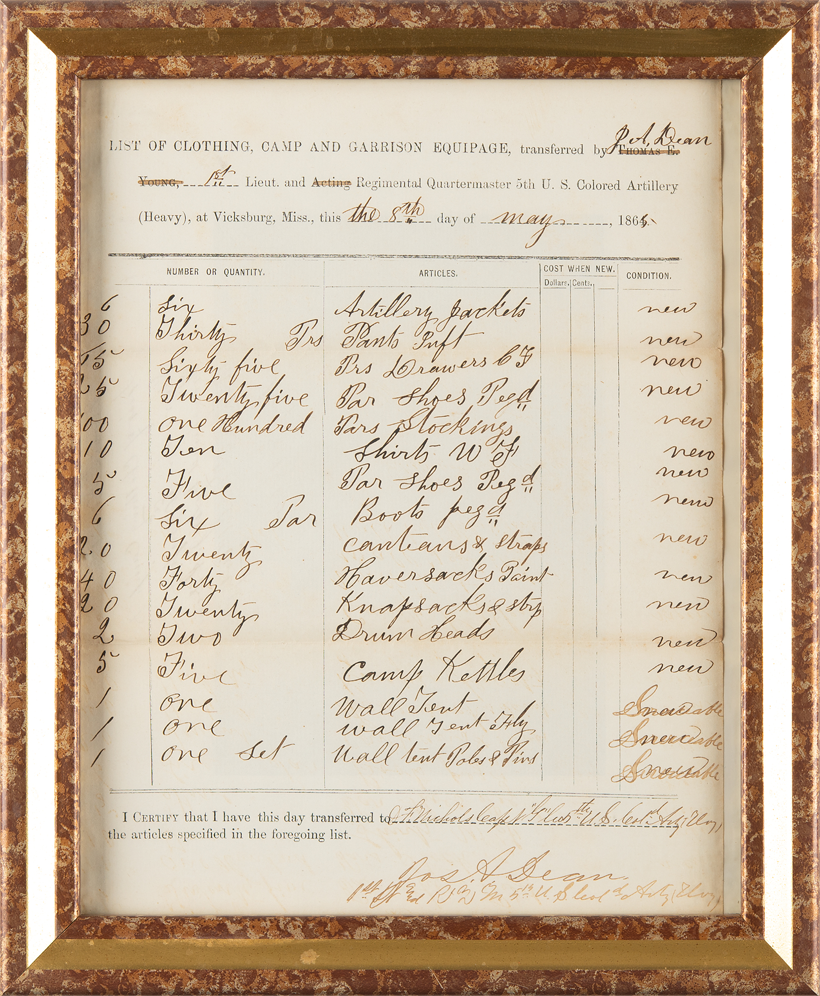 - May 8, 1865: a "List of Clothing, Camp and Garrison Equipage, transferred by J. A. Dean, 1st Lieut. and Regimental Quartermaster 5th U.S. Colored Artillerty (Heavy), at Vicksburg, Miss.," documenting the transfer of new equipment to include artillery jackets, pants, shoes, stockings, shirts, boots, knapsacks, drum heads, camp kettles, and tents, signed at the conclusion by Joseph A. Dean.