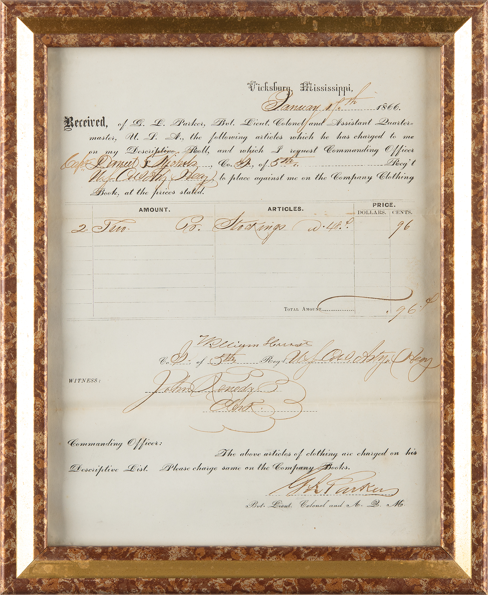 - January 17, 1866: a similar document certifying receipt of a pair of stockings by William Hurst, requesting "Commanding Officer Capt. Daniel F. Nichols, Co. G, of 5th Reg't U.S. Col. Arty. (Heavy), to place against me on the Company Clothing Book."