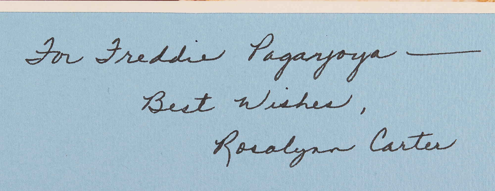 Lovely color satin-finish 7 x 9.75 half-length photo of Rosalynn Carter posing in the White House in front of a pastoral painting and a large flower arrangement, affixed to its original 11 x 14 cardstock mount, which is signed and inscribed in ink "For Freddie Pagayoya – Best wishes, Rosalynn Carter.” In very fine condition. The recipient, Fred Pagayoya, worked on the Special Support Staff in the White House during the Johnson, Nixon, and Ford administrations.