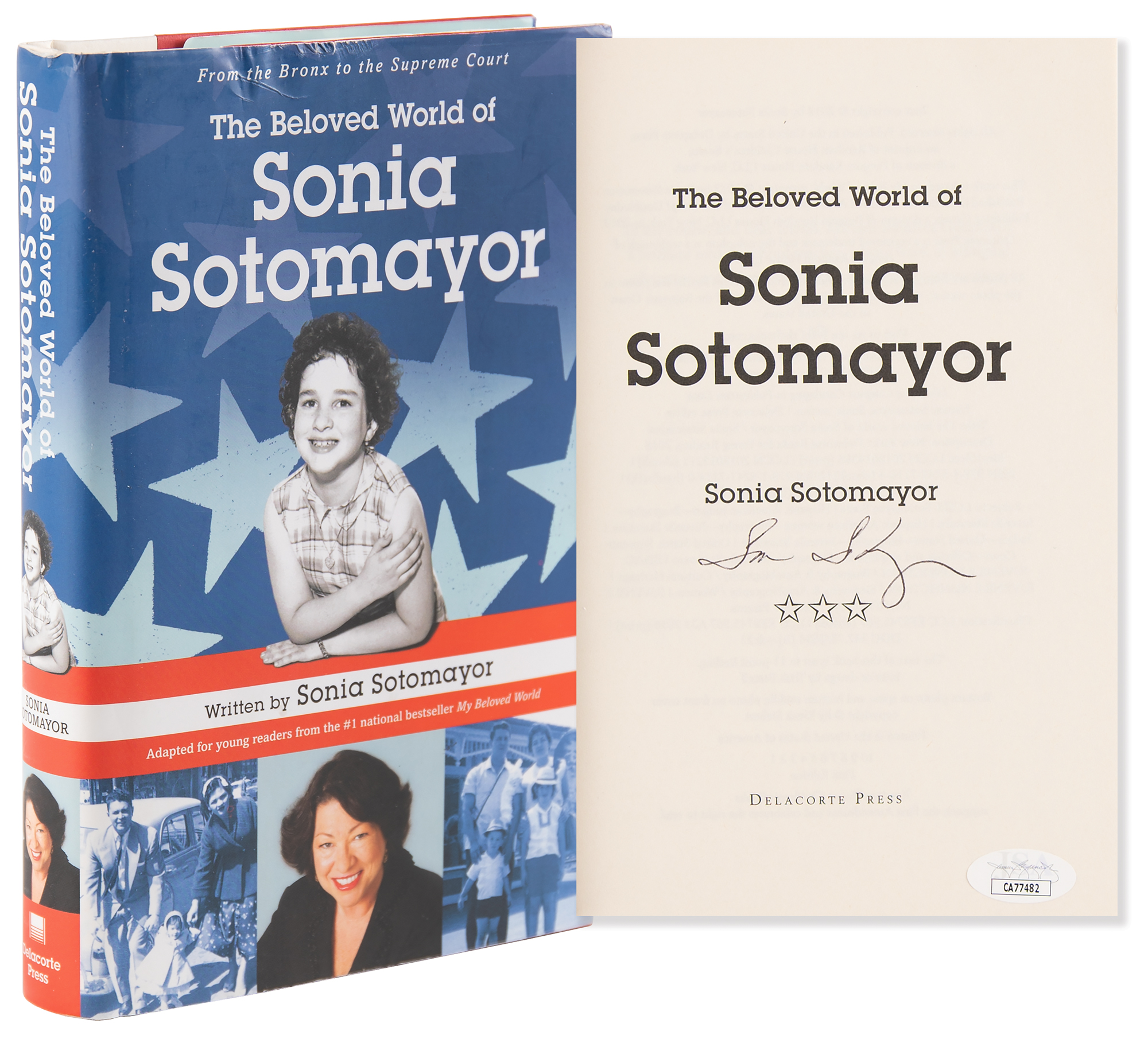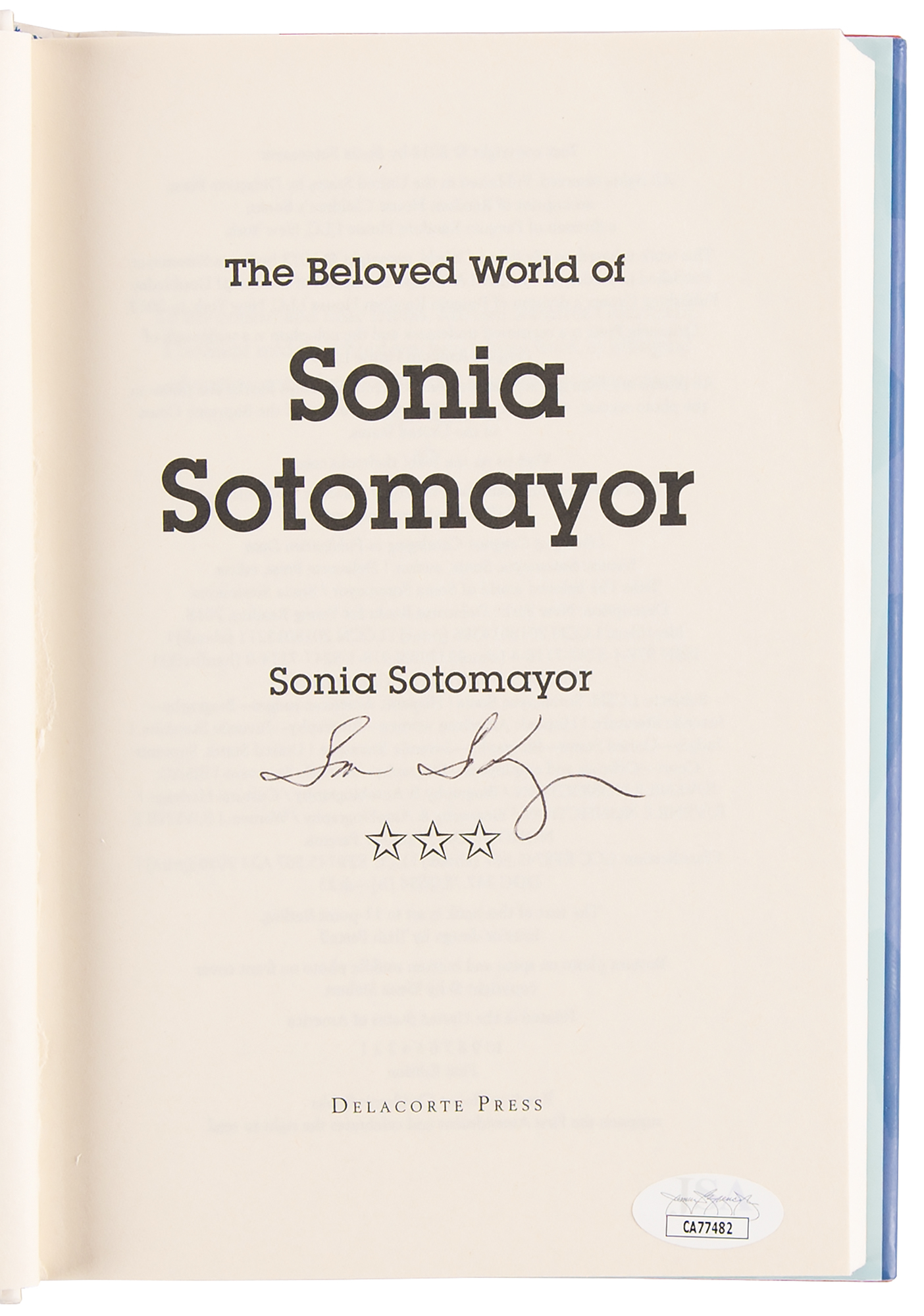 Signed book: The Beloved World of Sonia Sotomayor. First edition. NY: Delacorte Press, 2018. Hardcover with dust jacket, 5.75 x 8.5, 343 pages. Signed on the title page in black ballpoint by Sonia Sotomayor. In fine condition, with creasing to a few pages and a JSA label affixed to the signed page. Accompanied by a certificate of authenticity from JSA.