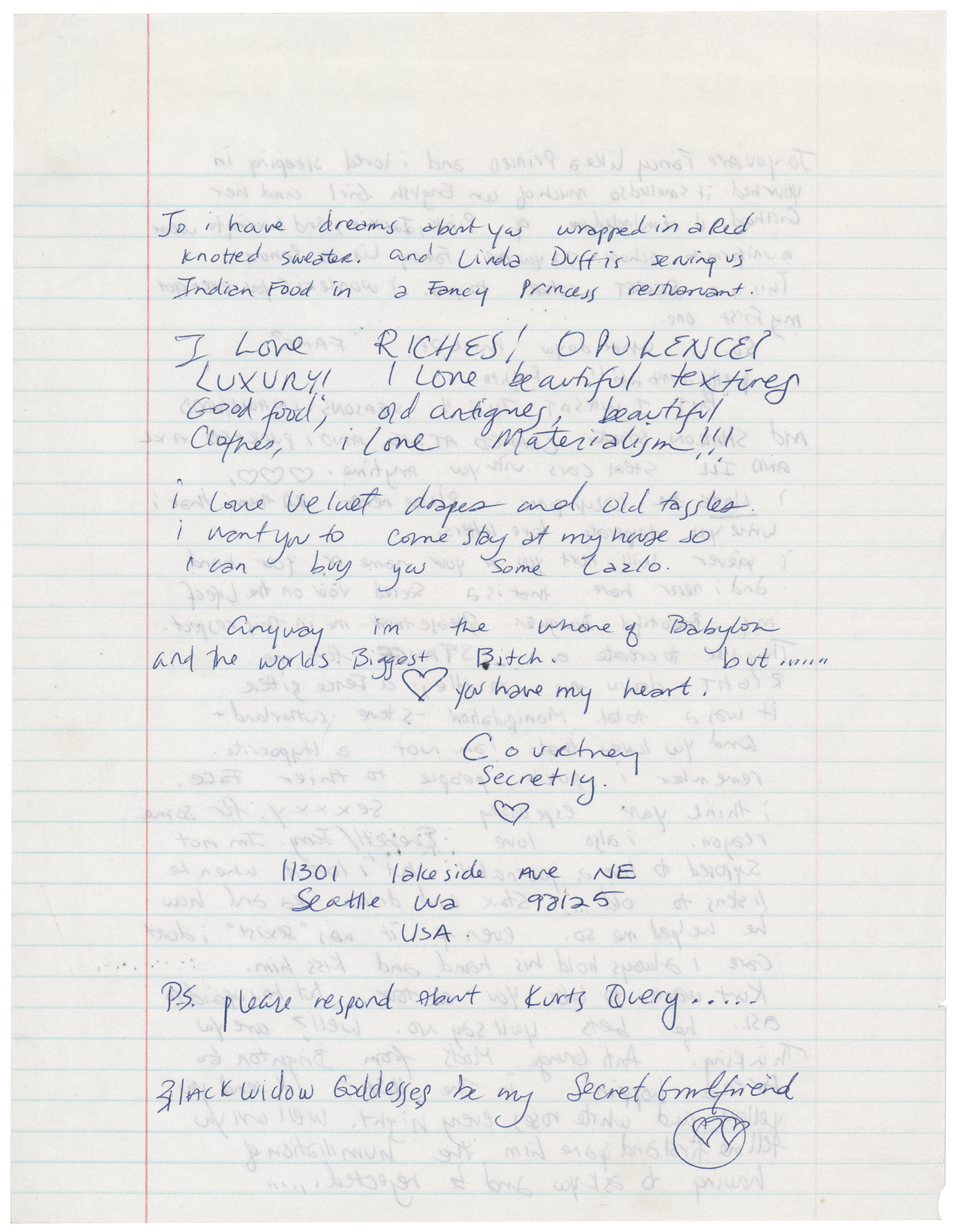 “Kurt wants to take you on tour”—handwritten letter from Courtney Love during her relationship with Kurt Cobain—“I was at the 4 Seasons in Hollywood and Sharon Stone glared at me and I punched Axl and I’ll steal cars with you anytime”
