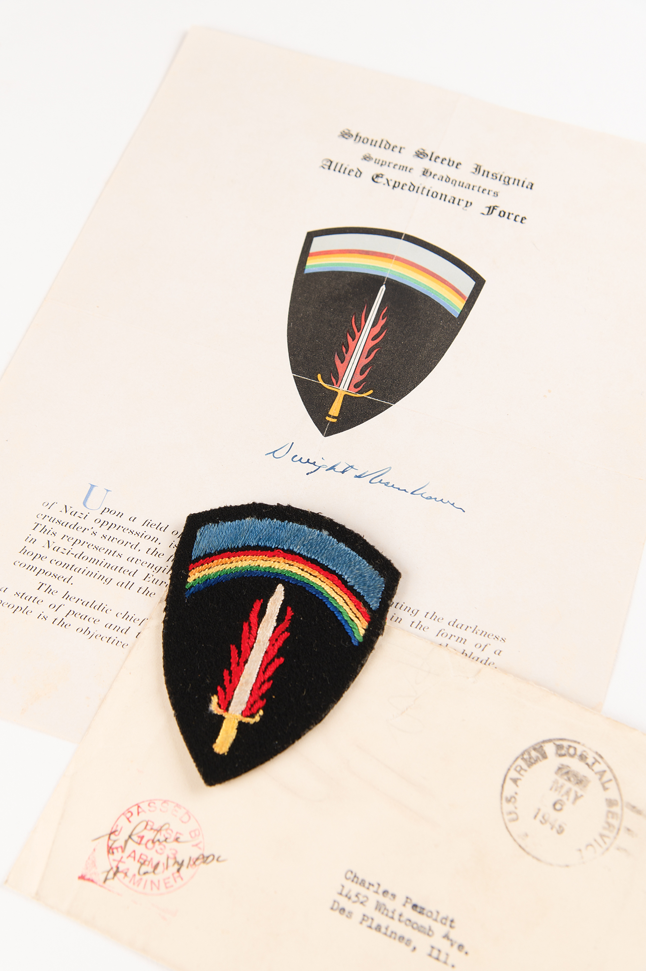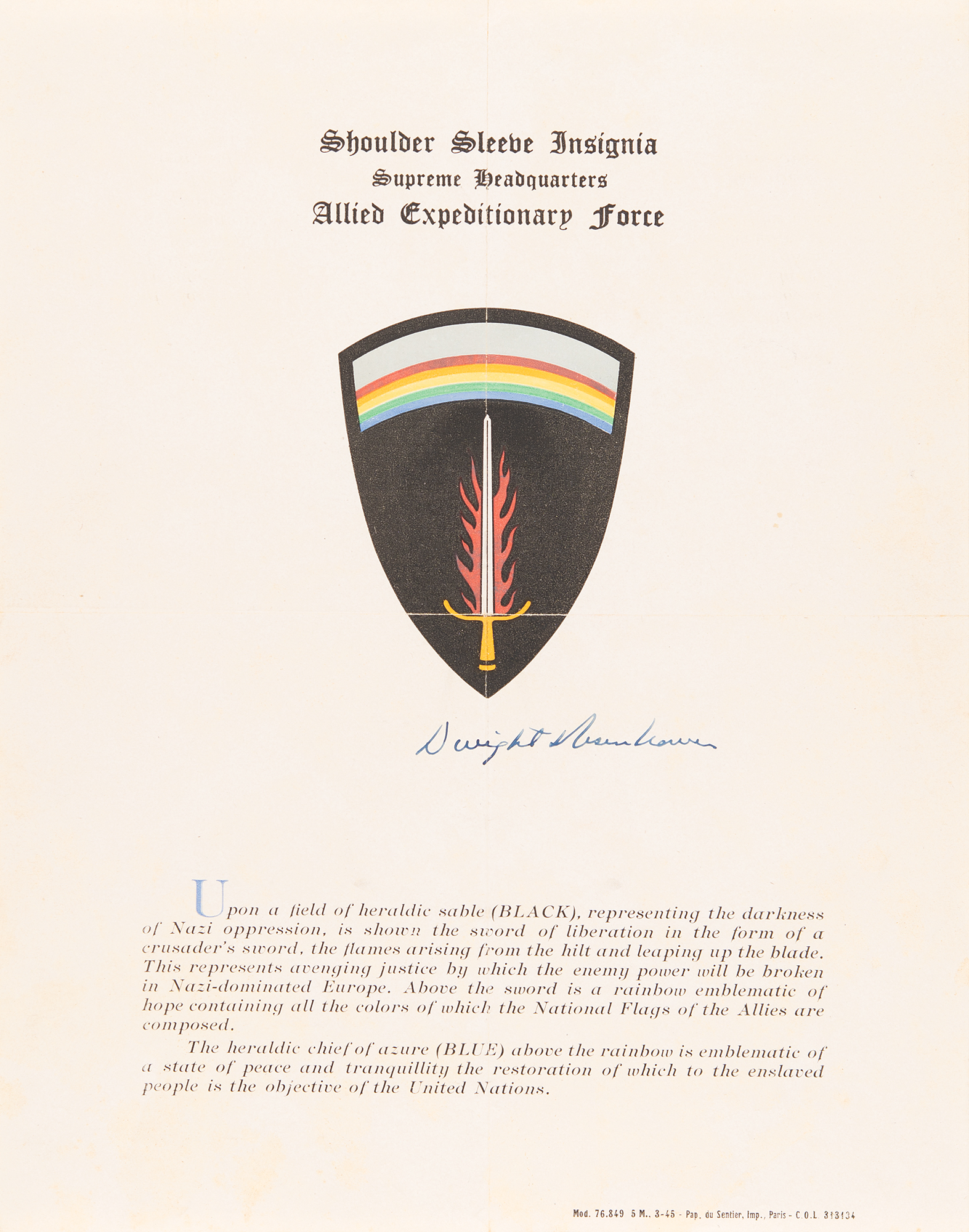 World War II-dated printed presentation sheet, signed in fountain pen by General Dwight D. Eisenhower, one page, 8 x 10.5, no date but postmarked May 6, 1945. The page is headed "Shoulder Sleeve Insignia, Supreme Headquarters, Allied Expeditionary Force," and features a color image of the insignia below. A description of the meaning behind the design of the patch is printed at the bottom, explaining that the black background represents "the darkness of Nazi oppression," the fiery crusader's sword representing "avenging justice," a rainbow comprised of the colors of the flags of the Allied forces to represent hope, and light blue at the top "emblematic of a state of peace and tranquility." In fine condition.