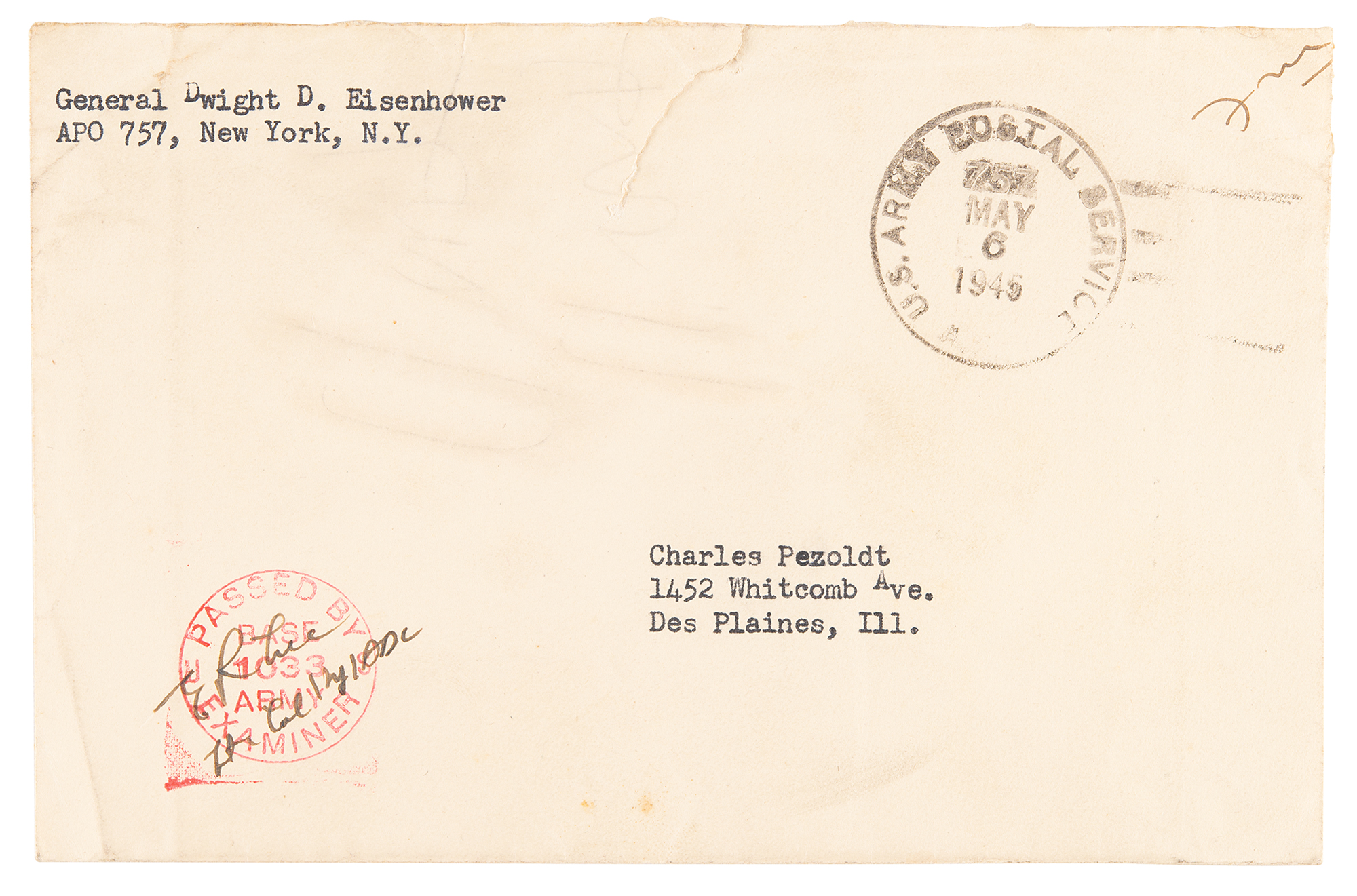 Accompanied by an actual example of the patch and the original mailing envelope bearing a cancellation date of May 6, 1945, one day before Germany signed the first Instrument of Surrender at the SHAEF (Supreme Headquarters Allied Expeditionary Force) headquarters in Reims, France, on May 7, 1945, marking the unconditional surrender of Nazi Germany and effectively ending the war in Europe.