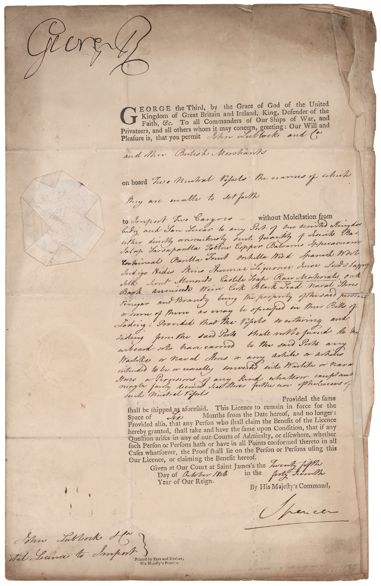 Partly-printed DS, signed “George R,” one page, 9.5 x 14.75, October 25, 1806. King George III grants a trading license to "John Lubbock and Co. and other British Merchants" on board two neutral vessels ("the names of which they are unable to set forth"), permitting them "to import two cargoes without molestation from Cadiz," and continuing to list their cargoes as including "Sarsaparilla, Tallow, Copper, Balsams… Spanish wool, Indigo, Hides, Skins…Liquorice Juice, Seeds, Saffron, Silk…Almonds, Castile Soap, Raw Materials, Oak Bark….Black Lead….Vinegar and Brandy." Signed at the head in ink by King George III, and countersigned at the conclusion by Home Secretary George Spencer. The white paper seal affixed in the left margin remains intact. In very good to fine condition, with light creasing, toning, and a few small tears to the rough right edge.