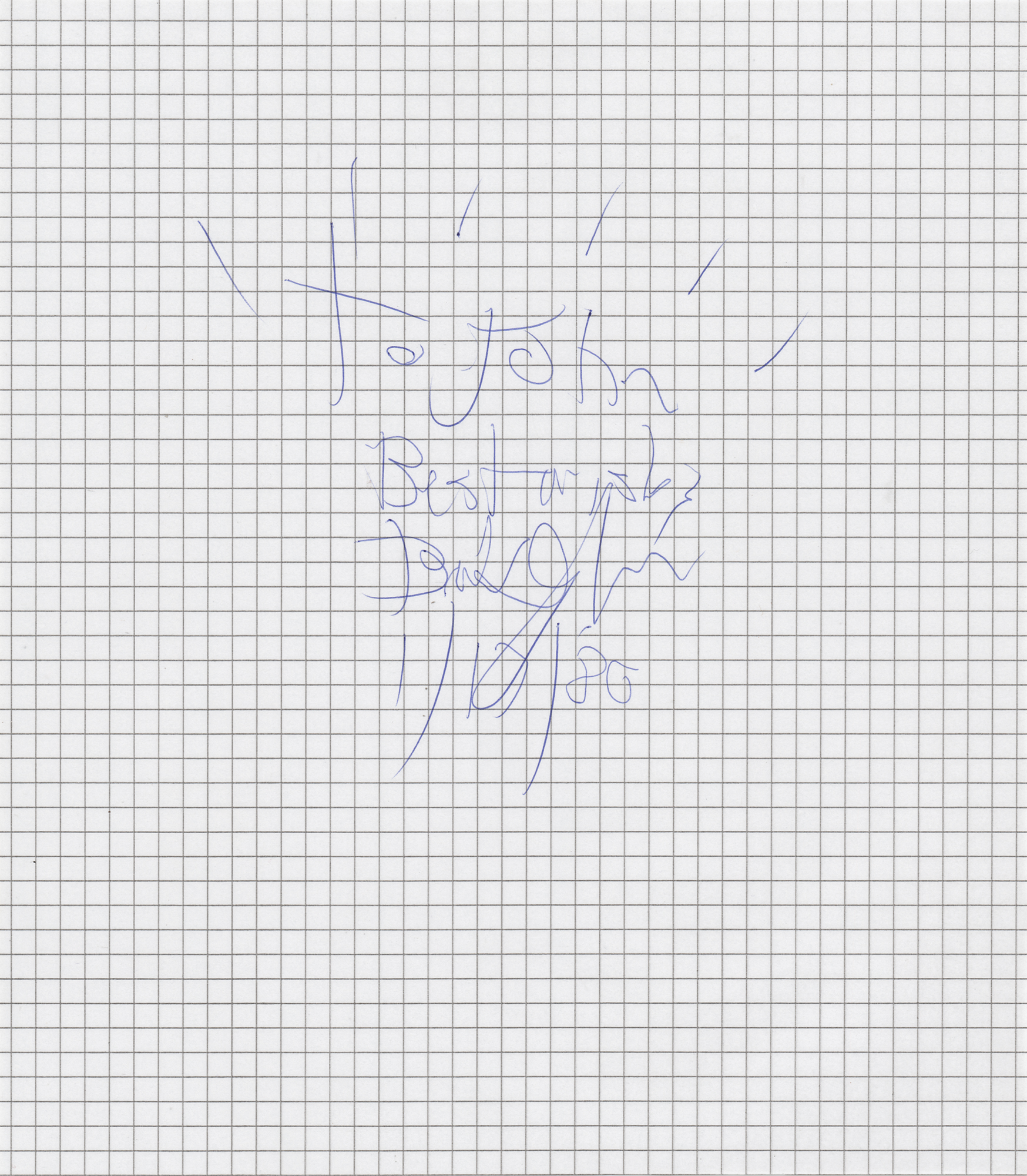 Ballpoint signature and inscription, "To John, Best wishes, Bob Dylan, 1/17/86,” on an off-white 8.25 x 9.5 sheet of graphing paper. In very fine condition. Accompanied by a full letter of authenticity from REAL.