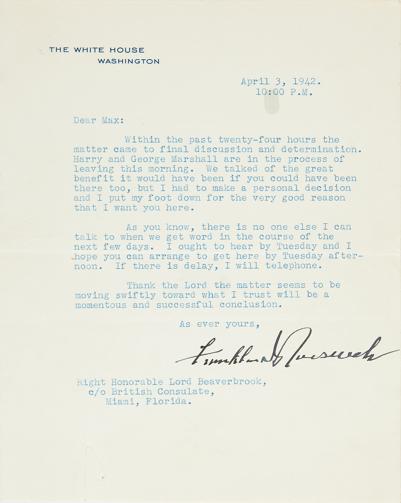 World War II?dated TLS as president, one page, 7 x 8.75, White House letterhead, April 3, 1942. Letter to influential British newspaper publisher Max Aitken, Lord Beaverbrook, alluding to the Allied decision to open a second front against Germany during World War II. In full: "Within the past twenty-four hours the matter came to final discussion and determination. Harry and George Marshall are in the process of leaving this morning. We talked of the great benefit it would have been if you could have been there too, but I had to make a personal decision and I put my foot down for the very good reason that I want you here.