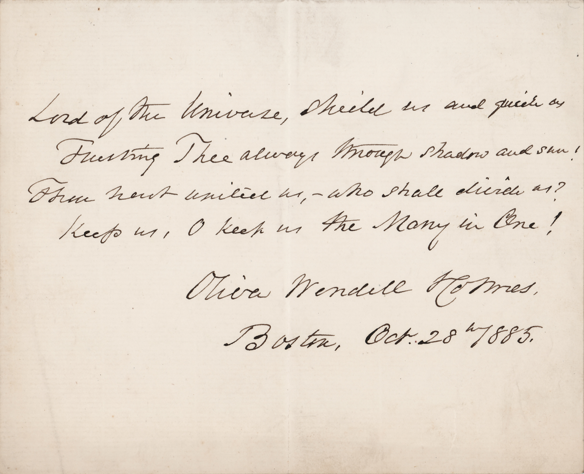 AQS from Oliver Wendell Holmes, Sr., on an off-white 6 x 4.75 sheet, signed at the bottom in black ink, “Oliver Wendell Holmes, Boston, Oct. 28, 1885,” who above writes four lines from his 1861 poem ‘Union and Liberty,’ in full: “Lord of the Universe! shield us and guide us, / Trusting Thee always, through shadow and sun! / Thou hast united us, – who shall divide us? / Keep us, O keep us the Many in One!” In fine condition, with a light crease to the lower left corner, and a light central vertical fold.