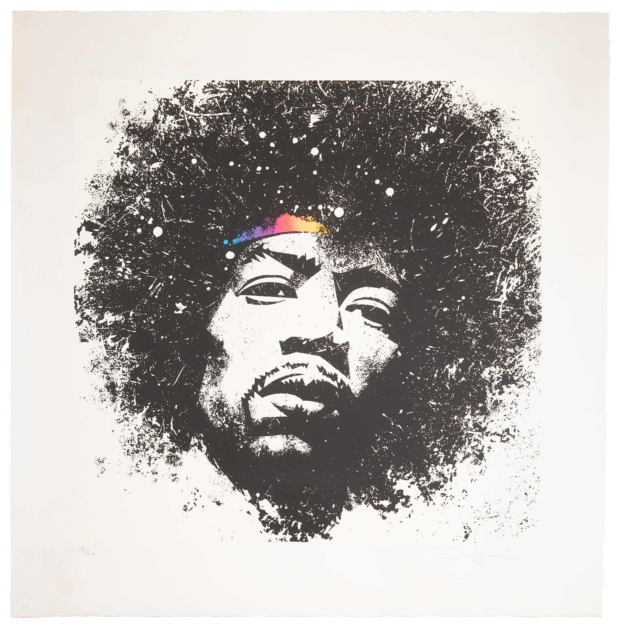 Striking limited edition color 28 x 28.25 silkscreen print of Mick Haggerty’s artwork design for the front cover of the Jimi Hendrix compilation album Kiss the Sky, which was released by Reprise Records and Polydor Records in late 1984, numbered 15/60, signed in the lower border in pencil by Haggerty, who adds “84/90,” dates reflecting the year the art was created and the year the print was published. In fine condition, with some light toning or dampstaining to the borders. In 1990, Haggerty made this stunning limited edition print in collaboration with master printmaker Richard Duardo. To our knowledge, this print was never available commercially.