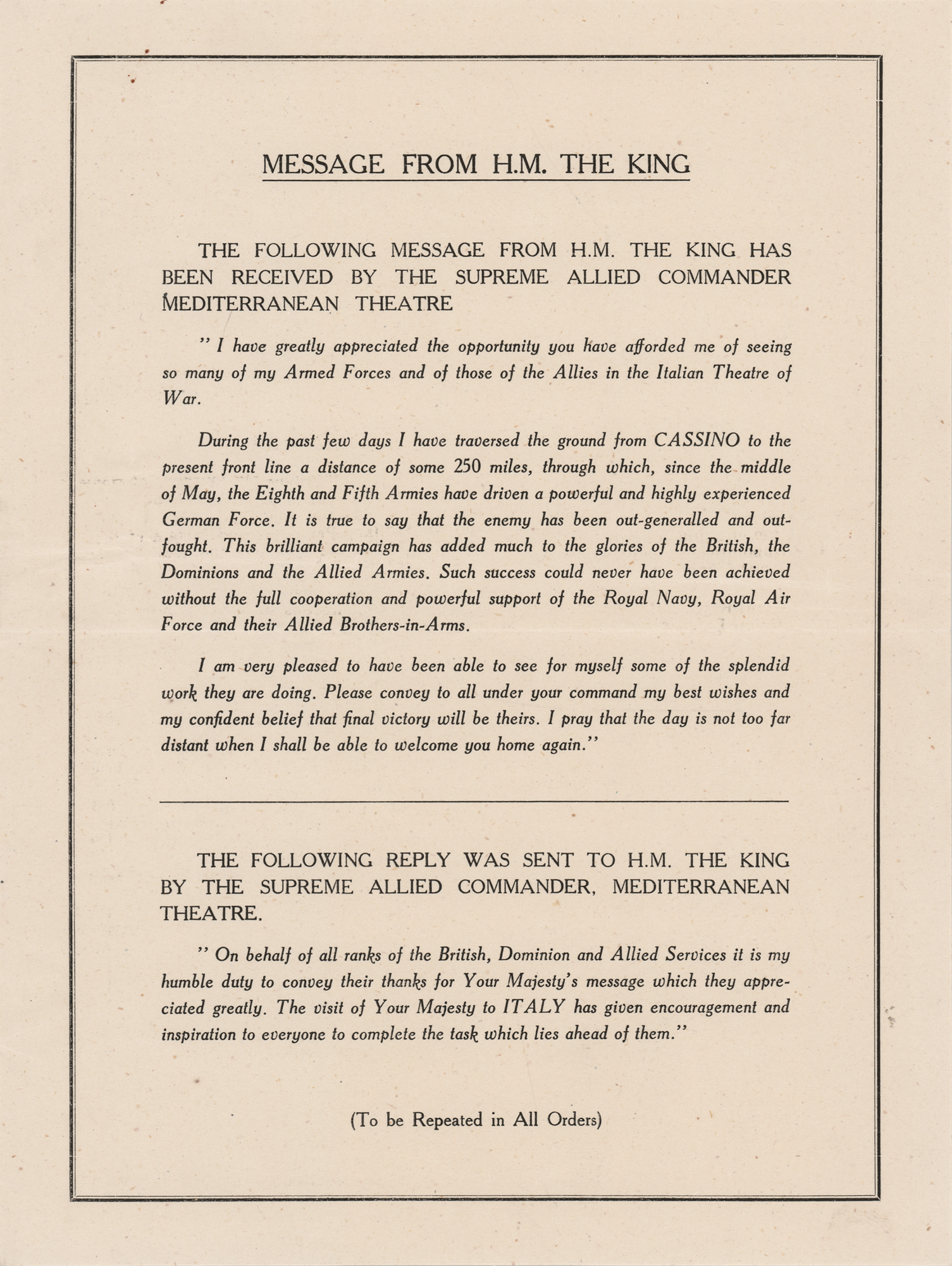 World War II-era broadside message from King George VI, one page, 7.5 x 10, no date but circa August 1944. In part: "The following message from H.M. the King has been received by the Supreme Allied Commander Mediterranean Theatre: 'I have greatly appreciated the opportunity you have afforded me of seeing so many of my Armed Forces and of those of the Allies in the Italian Theatre of War. During the past few days I have traversed the ground from Cassino to the present front line a distance of some 250 miles, through which, since the middle of May, the Eighth and Fifth Armies have driven a powerful and highly experienced German Force. It is true to say that the enemy has been out-generalled and out- fought. This brilliant campaign has added much to the glories of the British, the Dominions and the Allied Armies. Such success could never have been achieved without the full cooperation and powerful support of the Royal Navy, Royal Air Force and their Allied Brothers-in-Arms. I am very pleased to have been able to see for myself some of the splendid work they are doing. Please convey to all under your command my best wishes and my confident belief that final victory will be theirs. I pray that the day is not too far distant when I shall be able to welcome you home again.'" In fine condition, with a central horizontal fold.